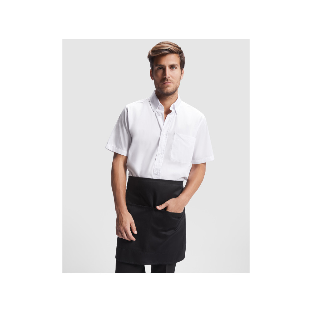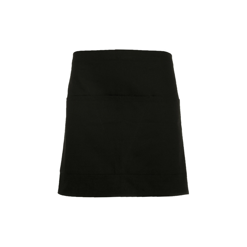 Tablier court avec poche 2 compartiments. Cordon au niveau de la ceinture. Dimensions: 71 cm x 43 cm.