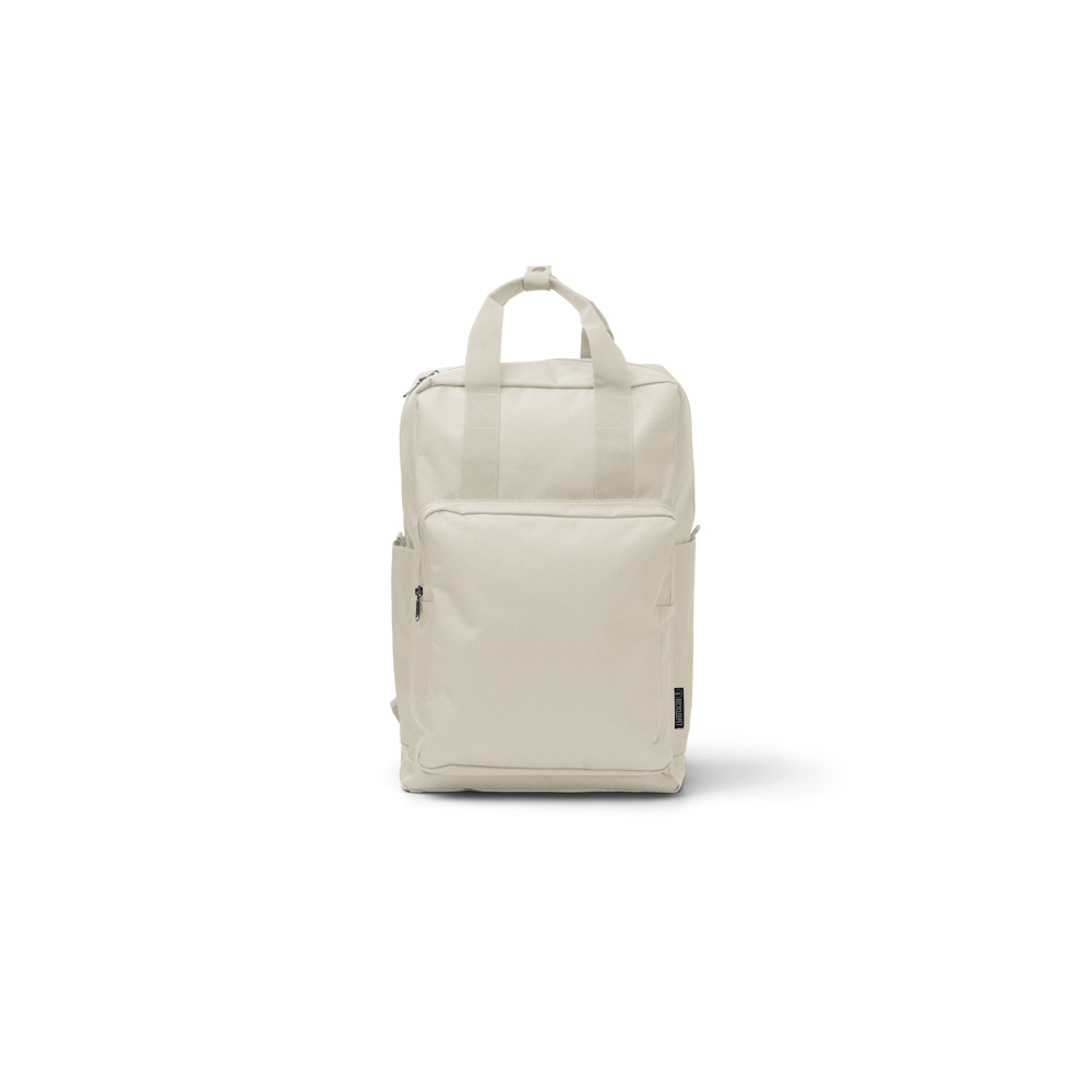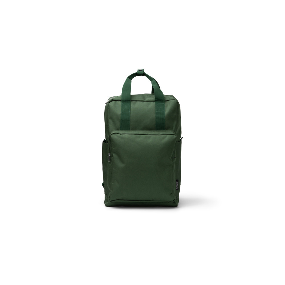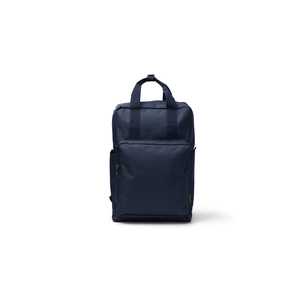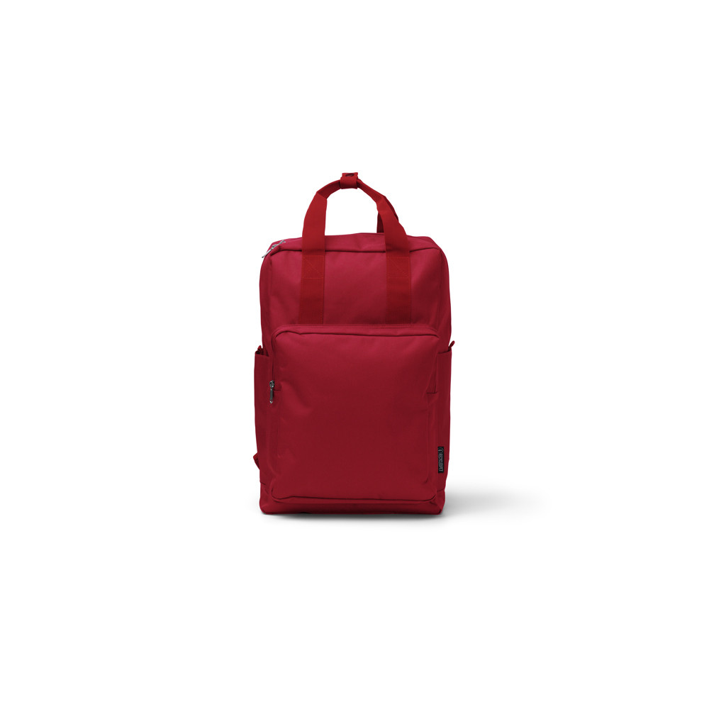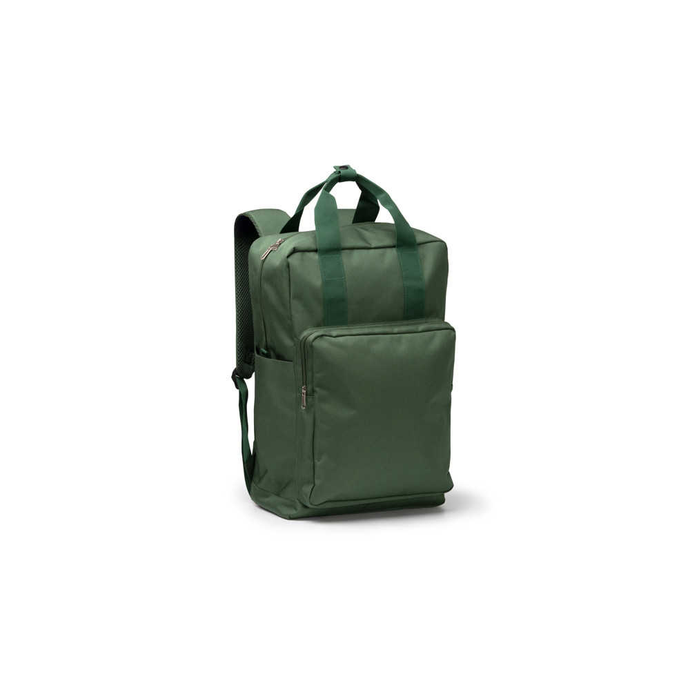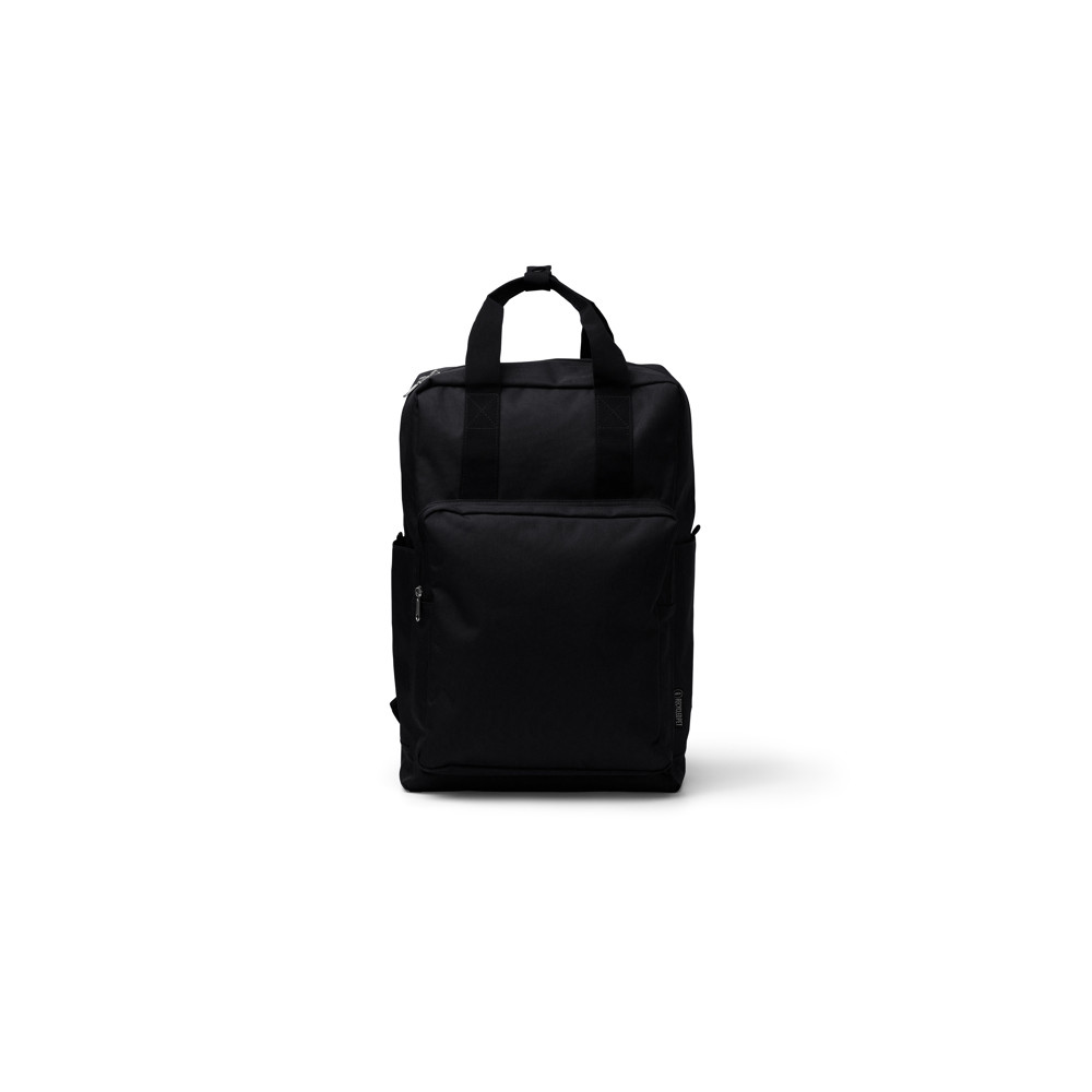 Sac à dos en polyester recyclé 600D avec compartiment principal. À l'intérieur, il a une poche pour transporter des ordinateurs portables jusqu'à 16 pouces. À l'extérieur, il comprend un compartiment avant avec fermeture à glissière, une double poignée de transport sur le dessus et des sangles et un panneau arrière rembourrés.