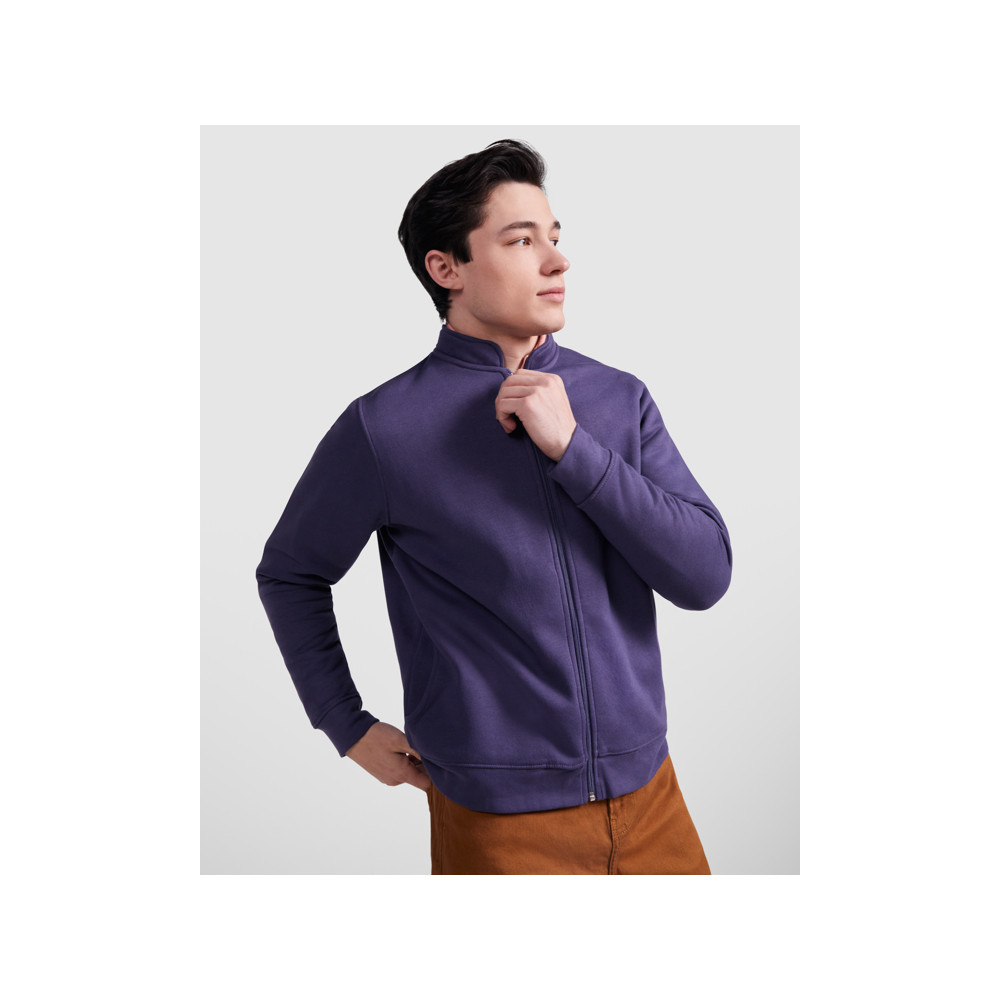 Veste en maille molleton gratté avec col Mao. Bande de propreté renforcée a l'encolure. Fermeture éclair central avec curseur ton sur ton. Poches latérales. Poignets et ceinture en côte 1x1.