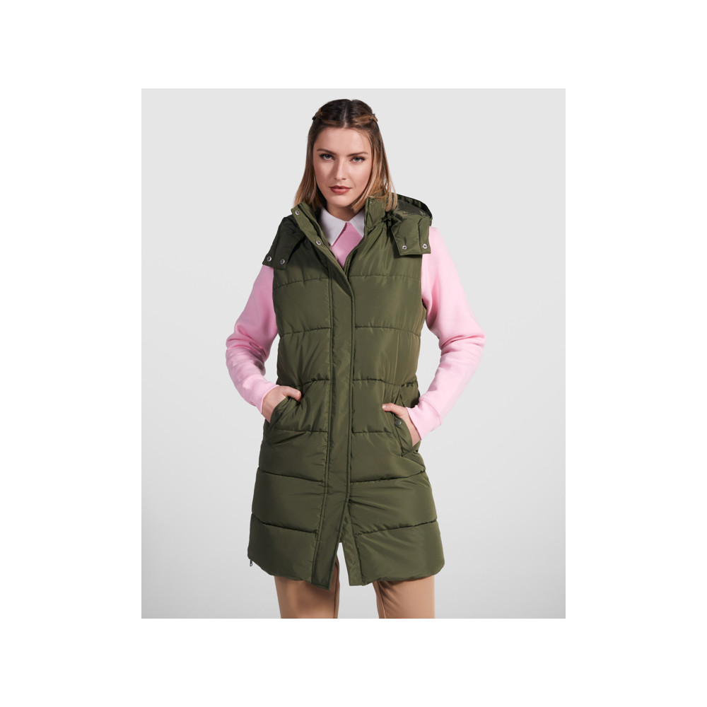 Gilet rembourré pour femmes avec capuche amovible. · Col montant · Fermeture éclair frontale dissimulée par rabat.· Deux poches avec bouton-pression.· Ouvertures latérales avec fermetures éclair.· Accès intérieur à la poitrine pour le marquageNotes et symboles : Hydrofuge.