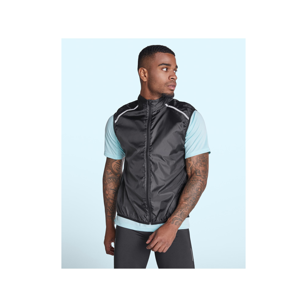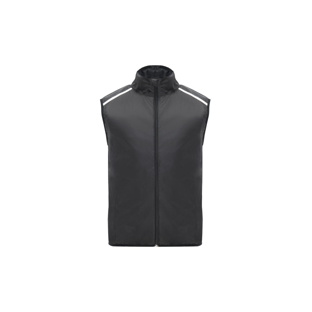 Gilet technique léger pour running.1.- Fermeture éclair ton sur ton, avec protection menton.2.- Bas et emmanchure avec liseré élastique. 3.-Bas du dos en tissu microperforé.4.- Détails réfléssichants en haut, face avant et arrière,5.- Poche avec élastique pour garder le gilet et le porter au poignet.
