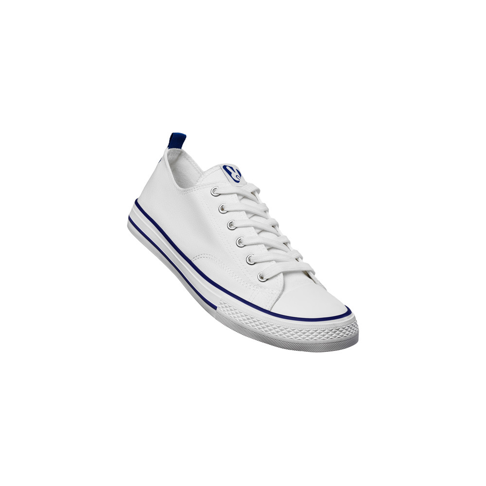 Basquet classique en toile avec semelle en caoutchouc blanc décorée de lignes colorées. Oeillets de ventilation latéraux, embout en caoutchouc et fermeture à lacets.