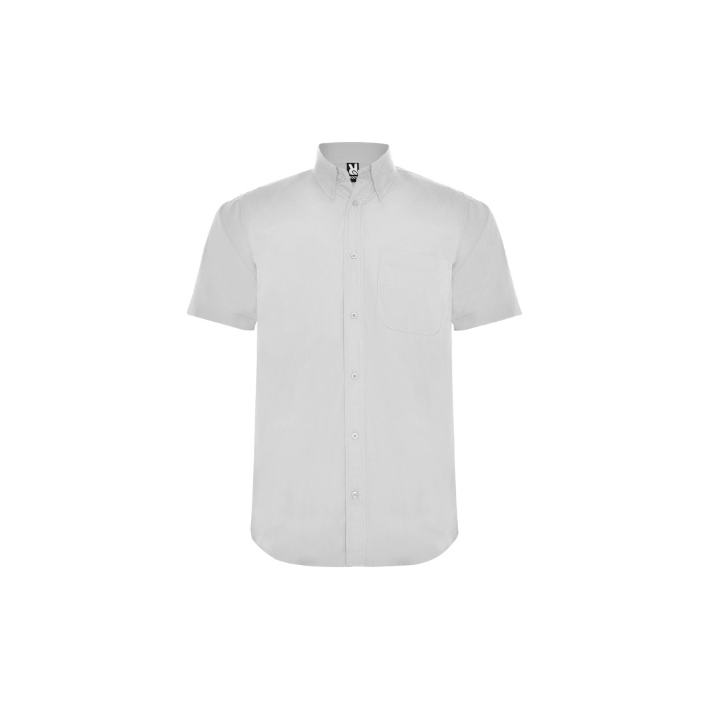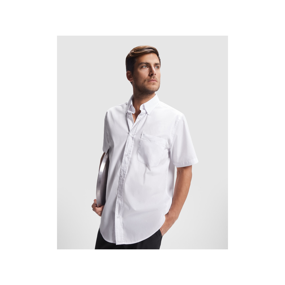 Chemise manches courtes et col classique almidonné et un bouton. Poche coeur, patte de boutonnage avec 7 boutons ton sur ton et bas avec forme. Entretien facile.