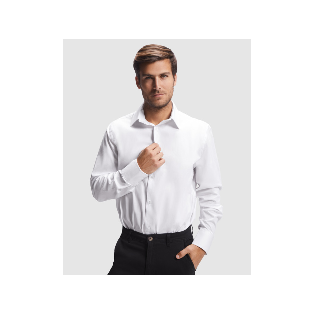 Chemise tissu stretch, manches longues et col avec tissu renforcé. Poignets avec 2 boutons et bas avec forme. Entretien facile.