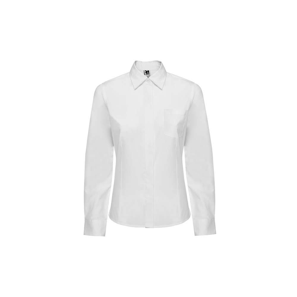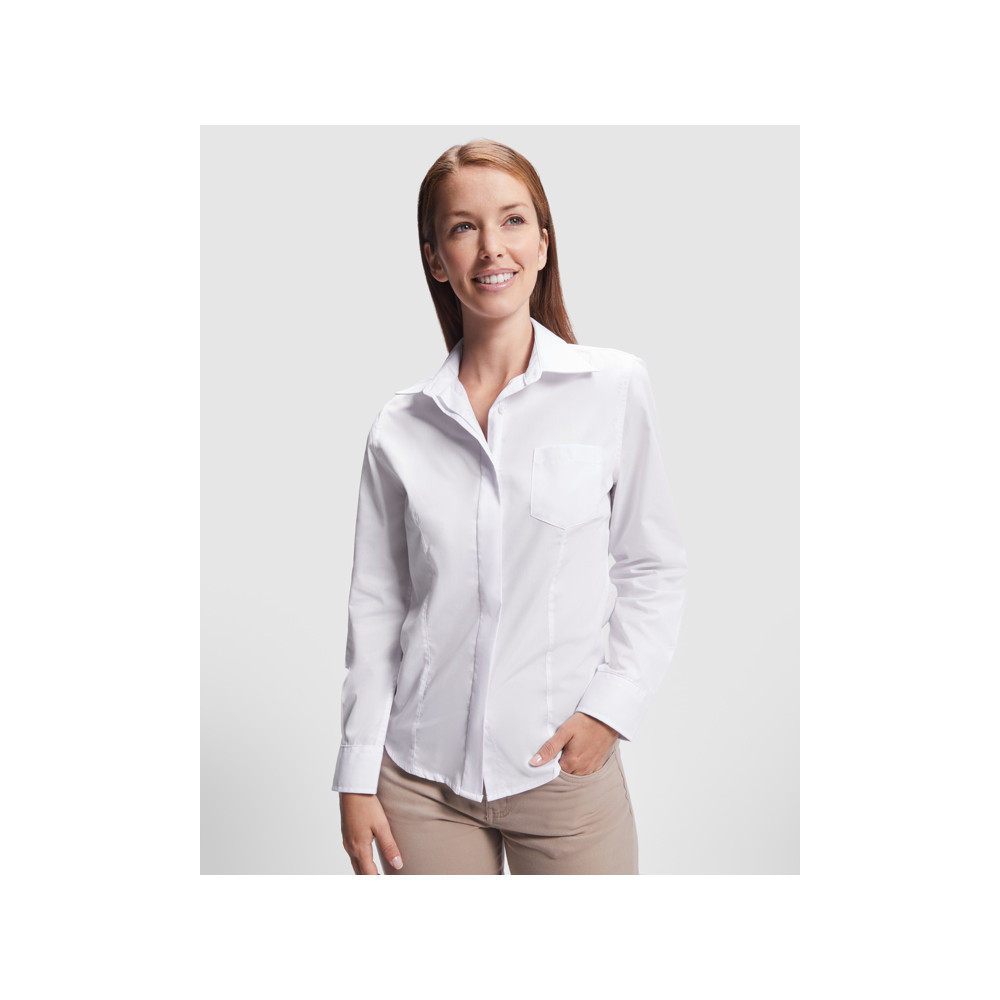 Chemise manches longues, coupe ajustée avec pinces en dos et buste, poche coeur et patte de boutonnage invisible. Poignets avec 2 boutons. Bas avec forme. Entretien facile.