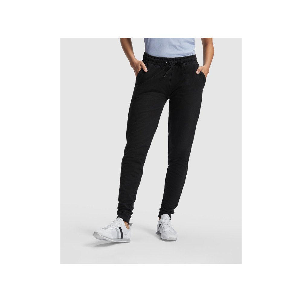 Pantalon de survêtement, avec une large ceinture ajustable avec cordon de serrage. Poches latérales. Bas serré. Tissu respirant.