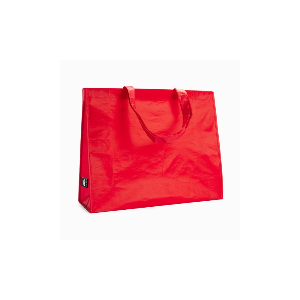 Sac à provisions réutilisable cousu avec finition laminé mat. Fabriqué en RPET résistant avec poignées renforcées et passepoil de la même couleur que le sac.