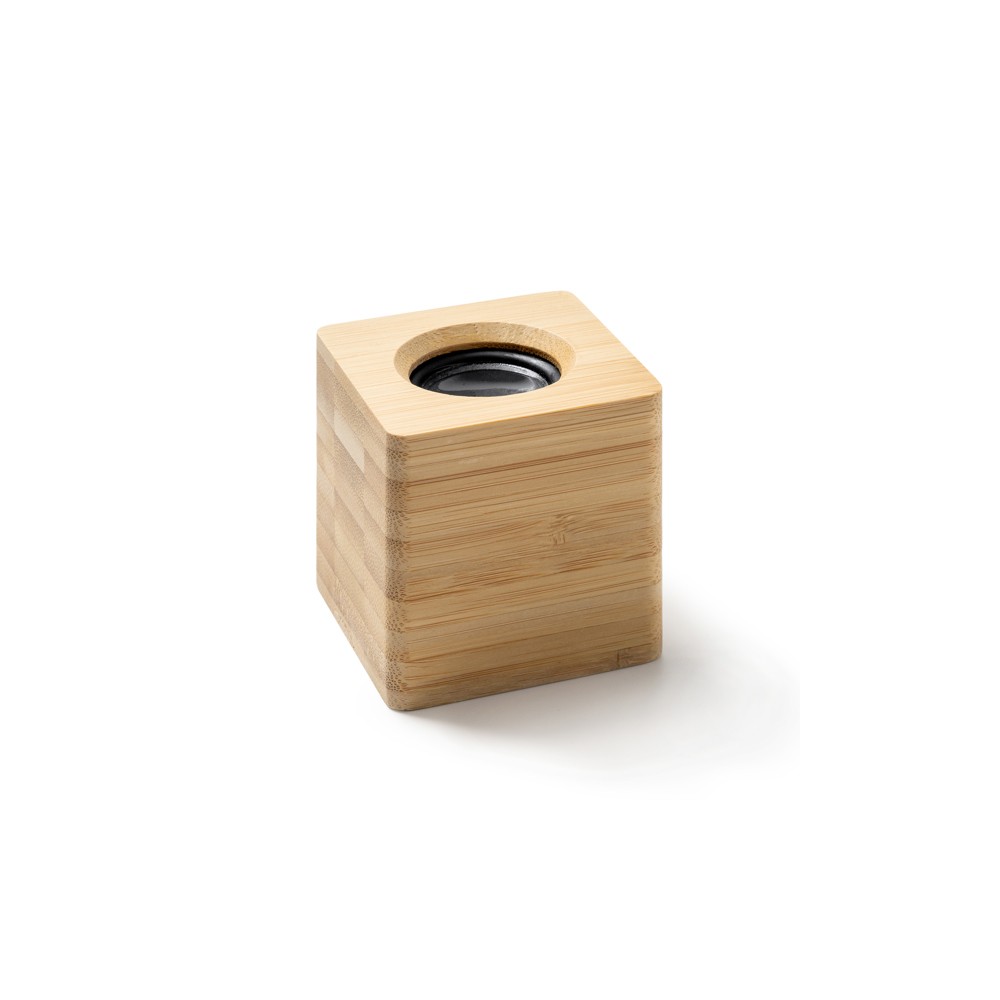 Fantastique haut-parleur sans fil avec corps en bois et membrane visible. Idéal pour le marquage au laser. Bluetooth 5.0, alimentation 3 W et batterie rechargeable. Câble fourni.