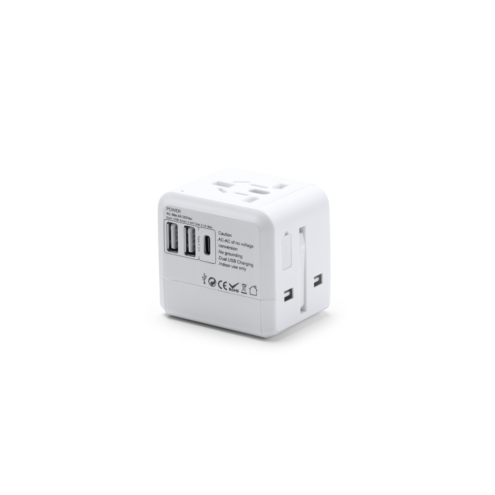 Adaptateur de voyage universel. Deux ports de sortie USB et un port de sortie de type C. Valable pour une utilisation en Europe, en Asie, au Royaume-Uni, aux États-Unis et en Australie. Présentation en boîte blanche.