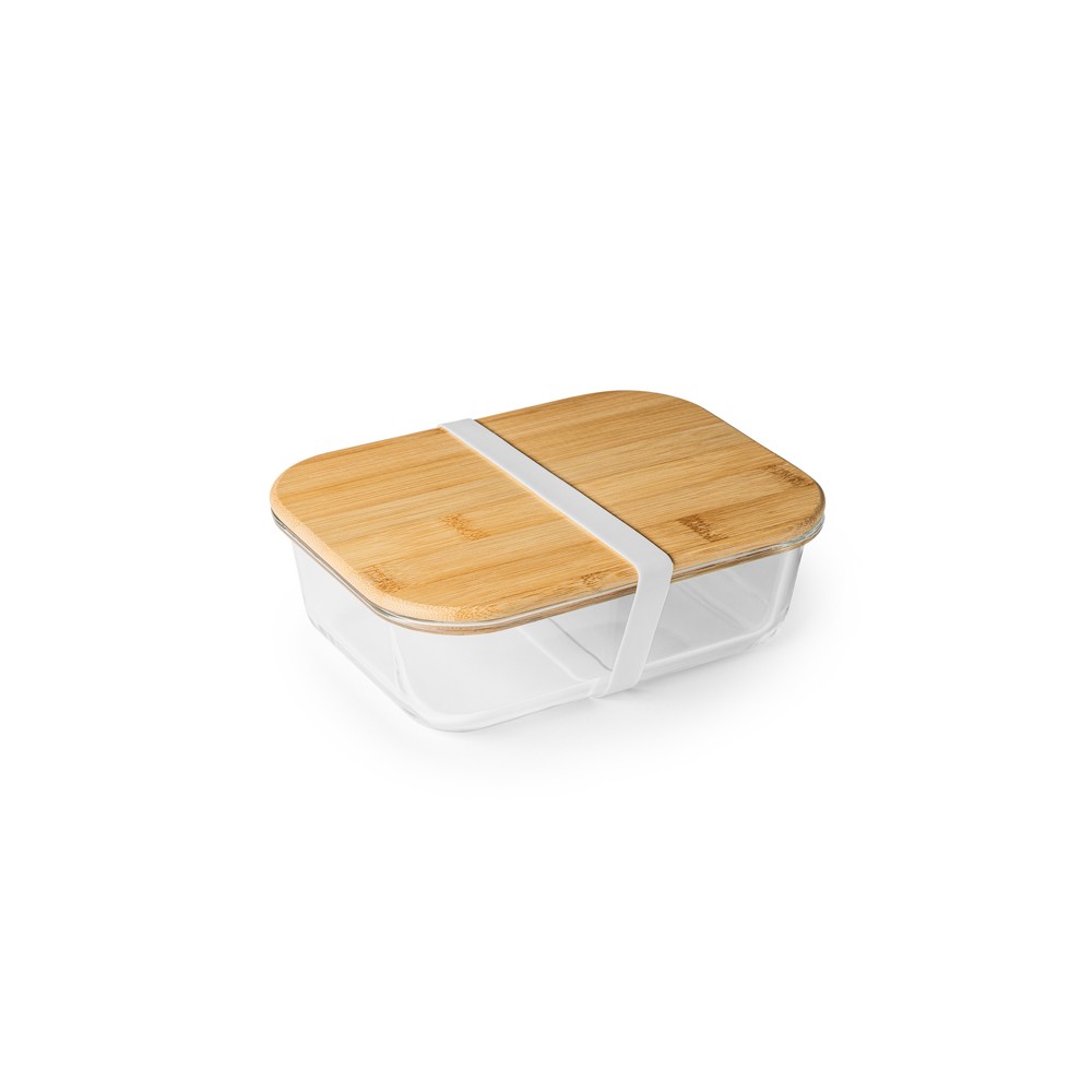 Boîte à lunch en verre Eco line, avec couvercle en bambou et bande de fermeture en silicone. Présentation en coffret éco design.