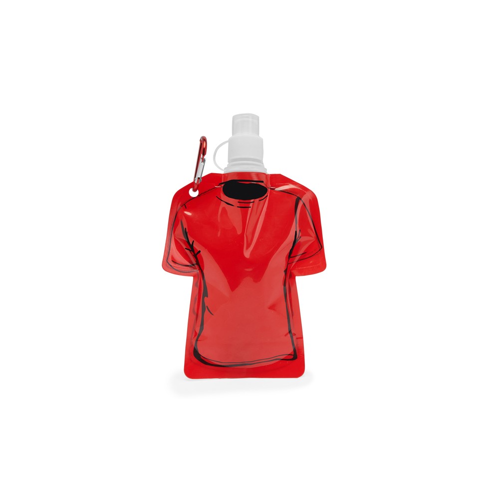 Bidon en PET flexible en forme de T-shirt. Bouchon de sécurité et mousqueton pour le transport. Capacité 470 ml.