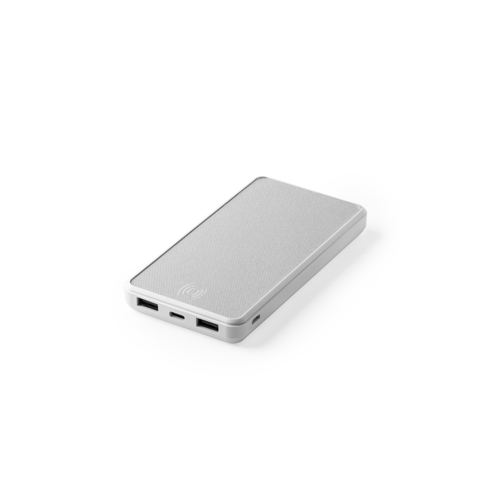 Batterie 8000 mAh externe avec corps en ABS recyclé et surface supérieure en tissu RPET. Sortie de courant USB DC 5 V/2,1 A. Sans fil 10 W. Comprend un câble micro USB.