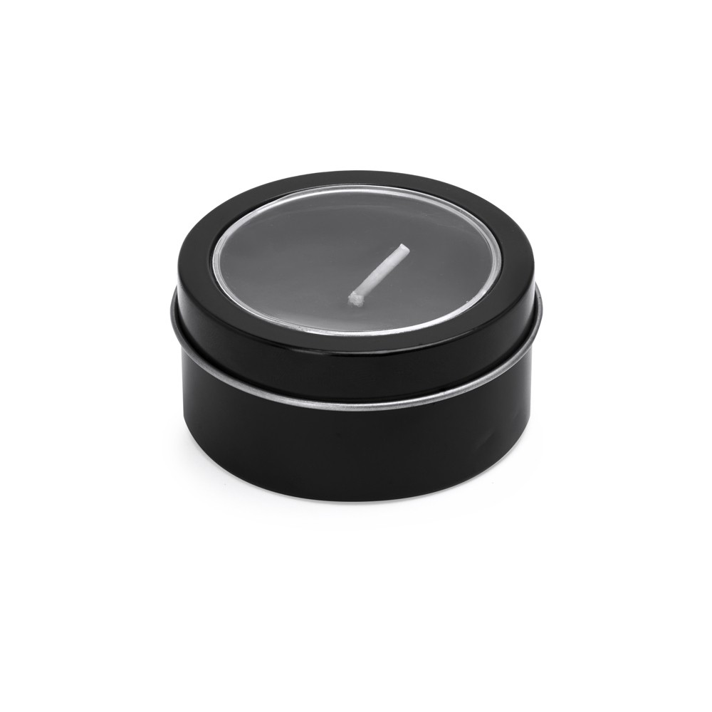 Bougie parfumée dans un récipient rond en métal, avec un couvercle avec une fenêtre transparente. Couleur de la bougie assortie au contenant. Mèche blanche.