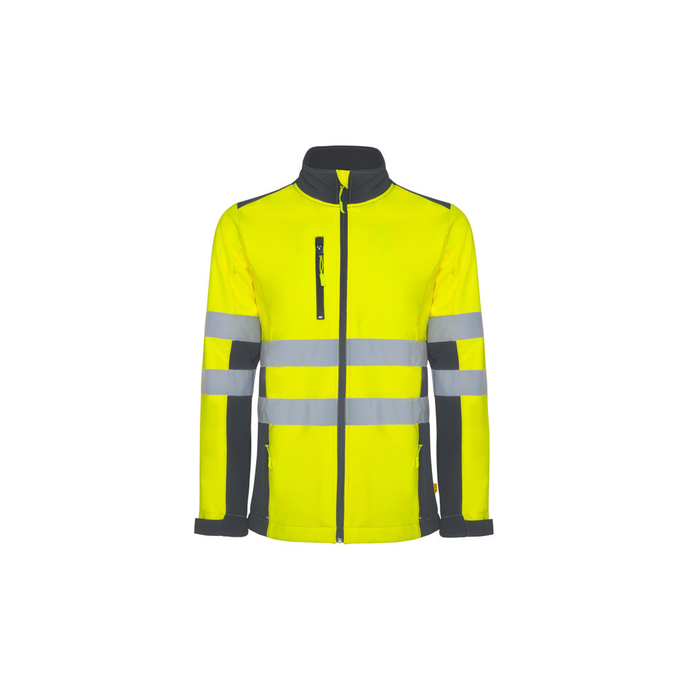 Veste softshell bicolore haute visibilité, 3 couches, déperlante.·Deux bandes segmentées sur le corps et une sur les manches. ·Fermeture à glissière avant inversée.·Deux poches latérales à fermeture à glissière et une poche poitrine droite.·Dispositif de réglage élastique sur l'ourlet intérieur inférieur.·Poignets réglables par velcro.·Étiquette extérieure Roly WRK.·Cycles de lavage : x25Destinataire :