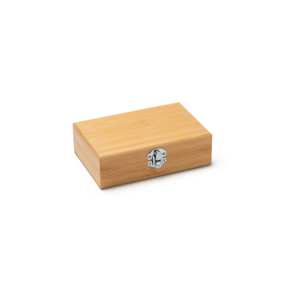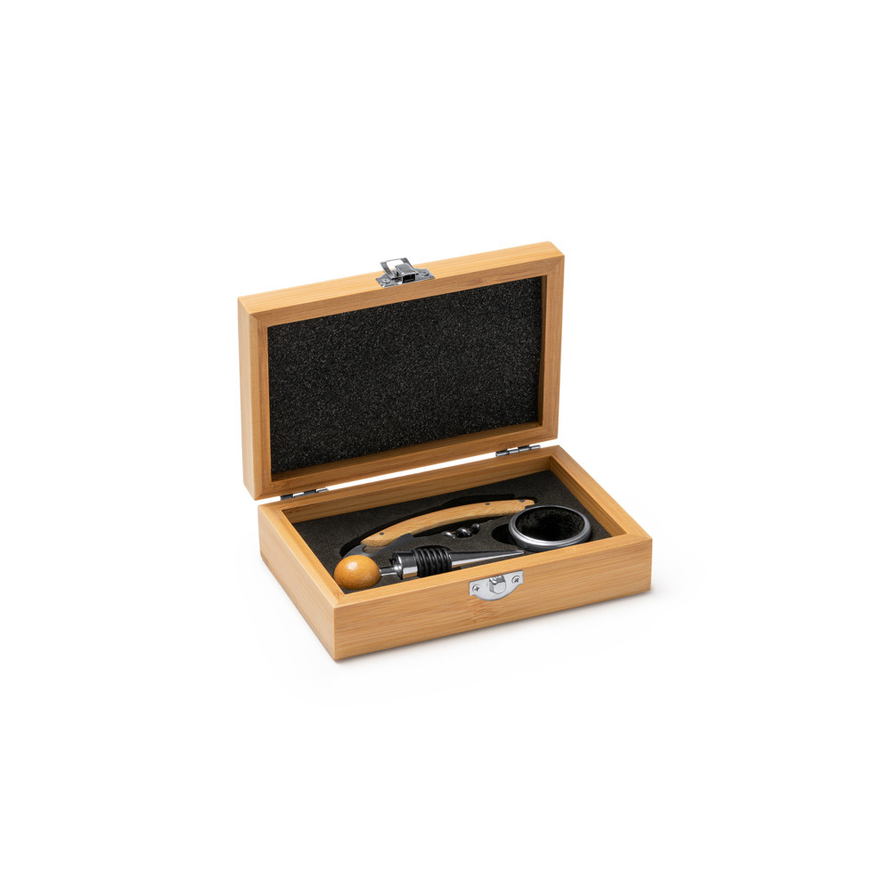 Ensemble pour vin avec accessoires en acier inoxydable et bambou. Tire-bouchon Pulltap avec lame pliante, bouchon et anneau d'égouttement. Présentation dans un étui en bambou avec doublure intérieure rembourrée et boîte éco-conception.Destinataire :