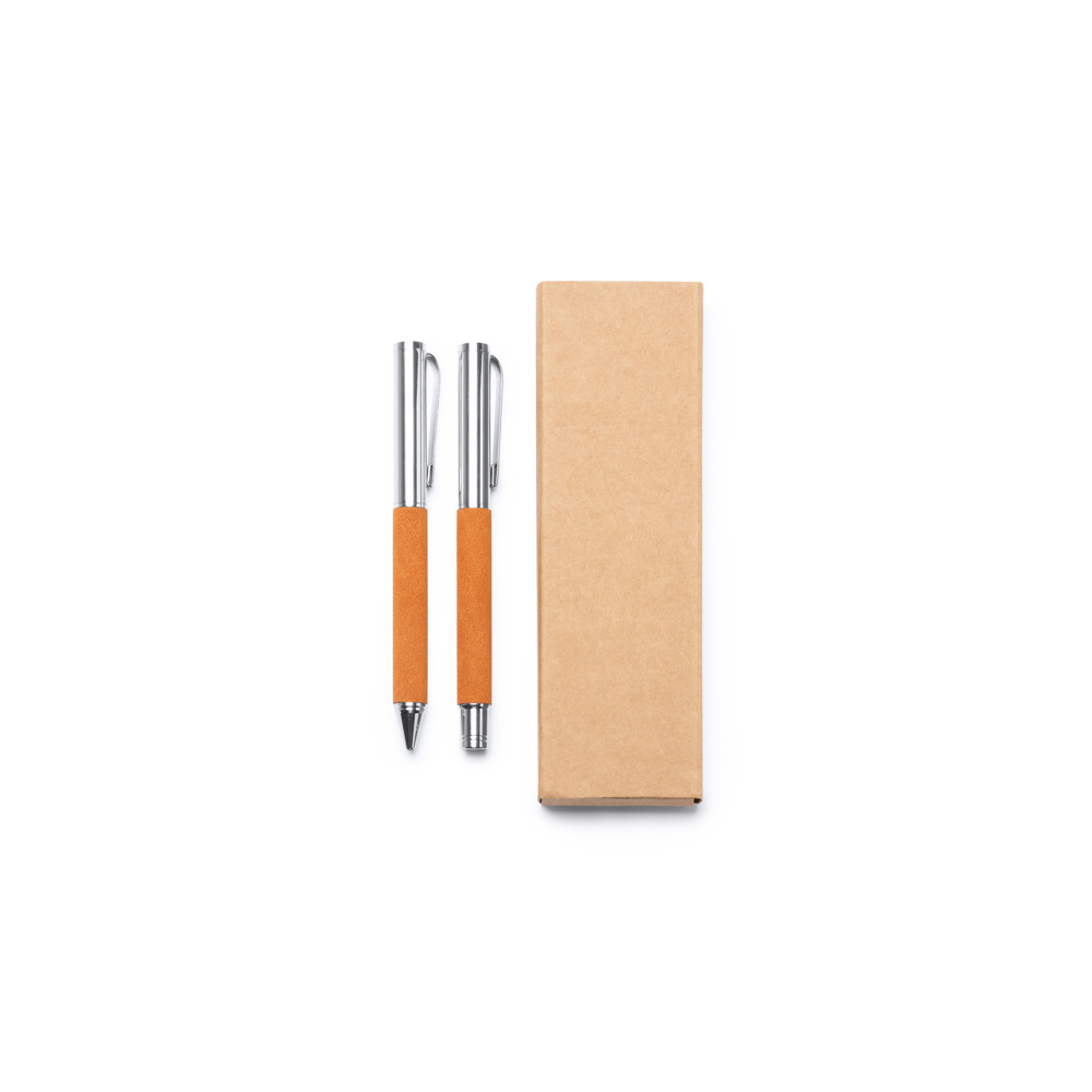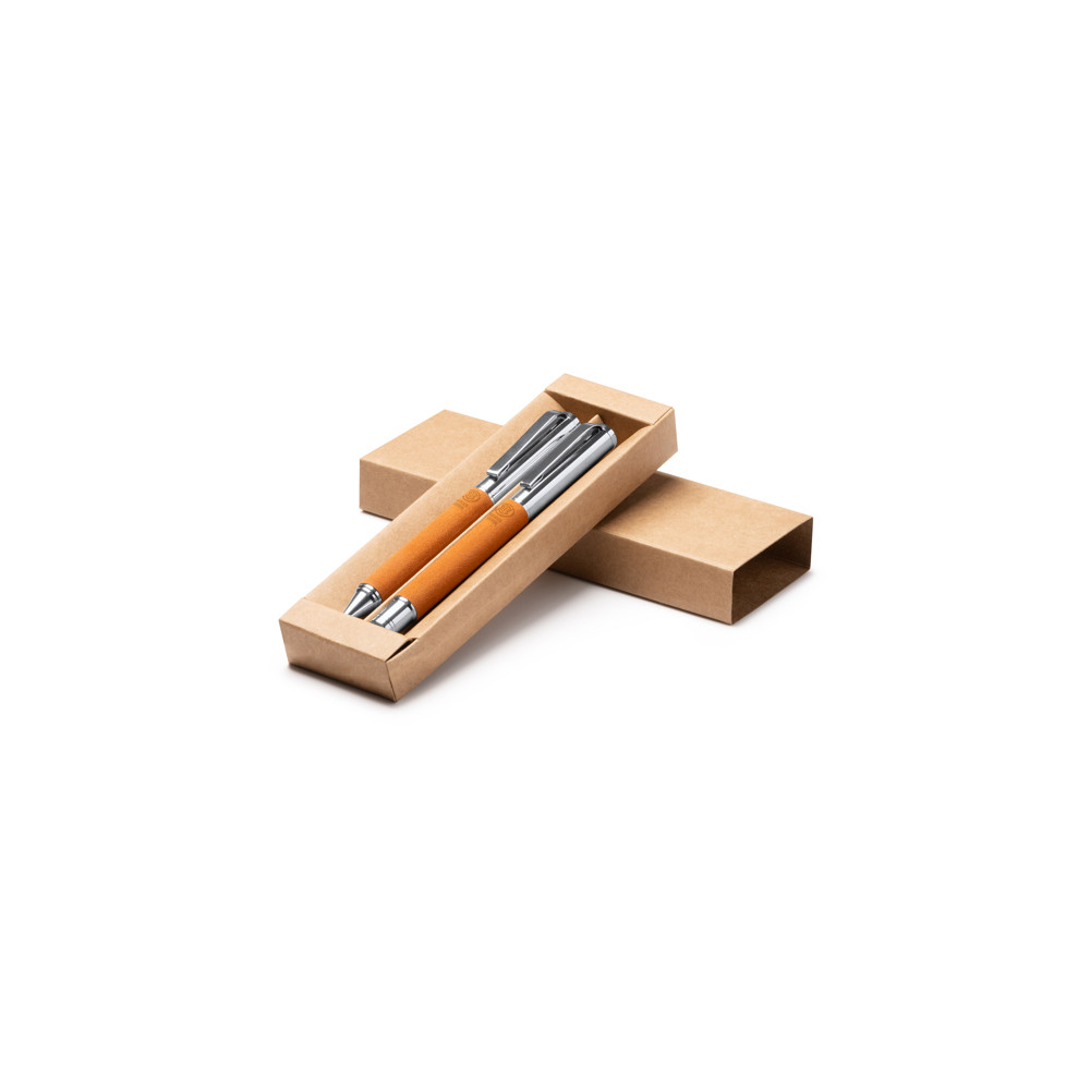 Jeu de stylos à bille et à rouleau avec structure principale en cuir recyclé, mécanisme de torsion et détails métalliques. Encre bleue. Présentation en boîte écodesign.Destinataire :