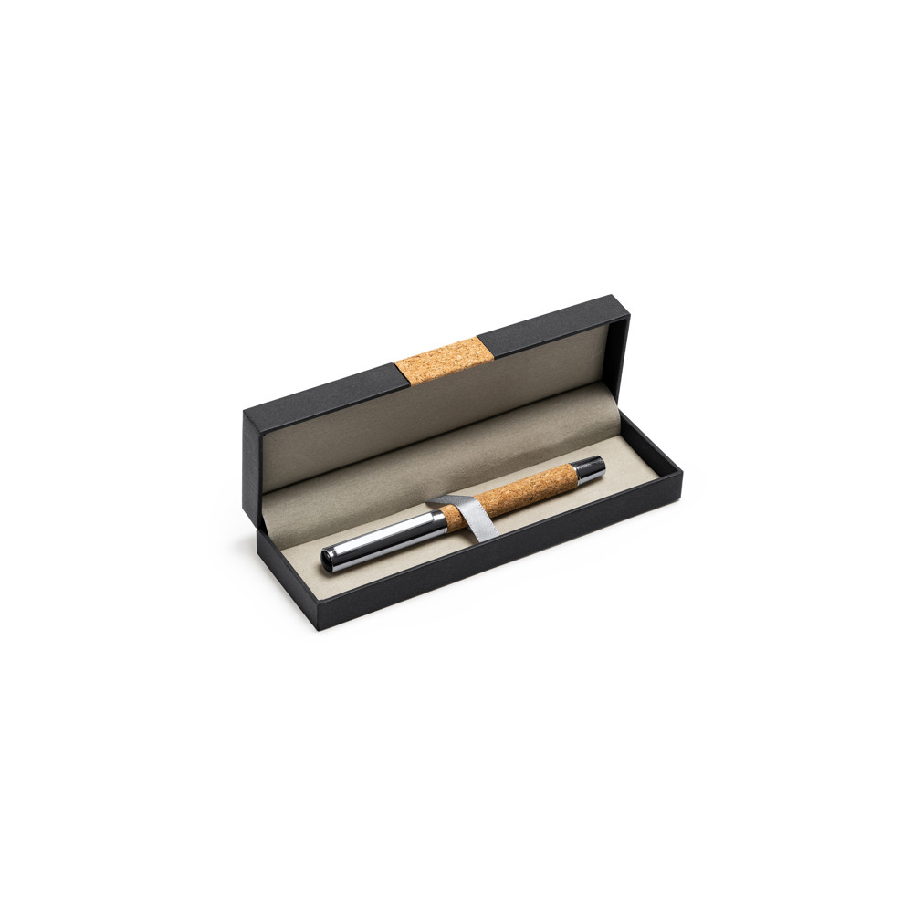 Stylo roller en liège naturel et acier. Présentation dans un élégant étui en liège avec doublure intérieure rembourrée. Encre bleu.Destinataire :