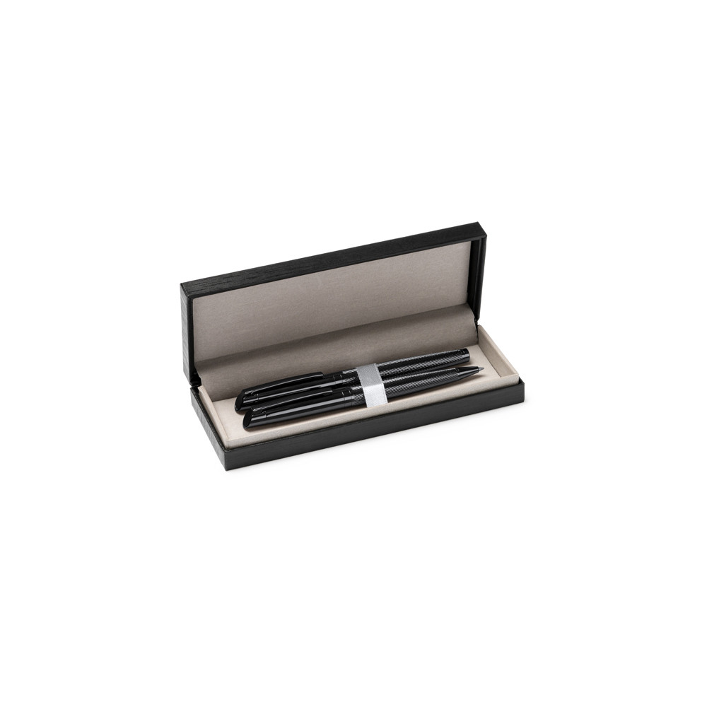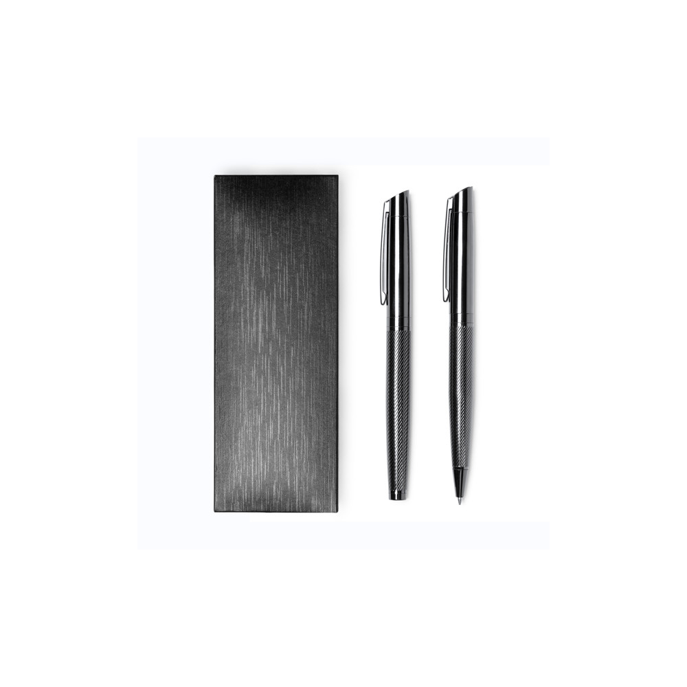 Boîte stylo à rouleau rotatif et crayon porte-mines élégante, dans un design en acier foncé. Présentation dans un étui rembourré en cuir avec doublure intérieure. Encre bleu.Destinataire :