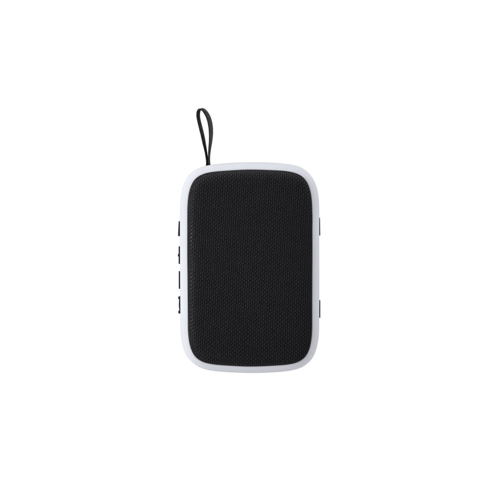 Haut-parleur sans fil bicolore avec Bluetooth. Corps en caoutchouc mat au toucher. Le design comprend une bague de transport, des boutons et un tissu assorti. Il a une puissance de 3 W et une batterie rechargeable. Câble fourni.Destinataire :