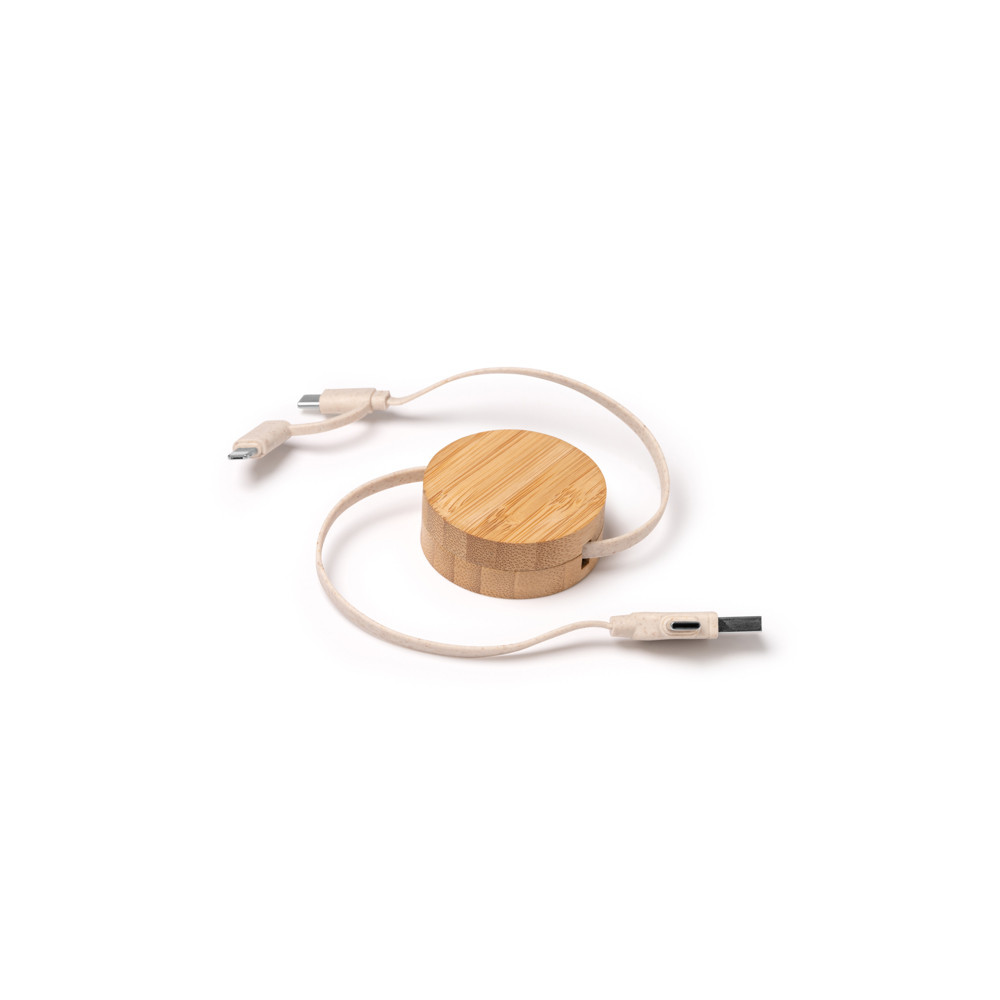 Câble de charge extensible avec structure principale en bambou et câble en fibre de blé. Entrées USB et Type C. Sorties Lightning et Type C. Présentation en sachet individuel écodesign.Destinataire :