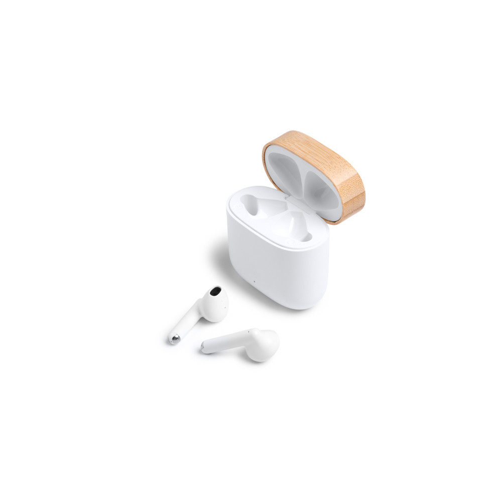 Écouteurs sans fil présentés dans un étui en ABS et bambou recyclé. Panneau de commande intégré avec technologie tactile. Fonction mains-libres. Batterie rechargeable. Câble de type-C inclus. Présentation en boîte écodesign.Destinataire :