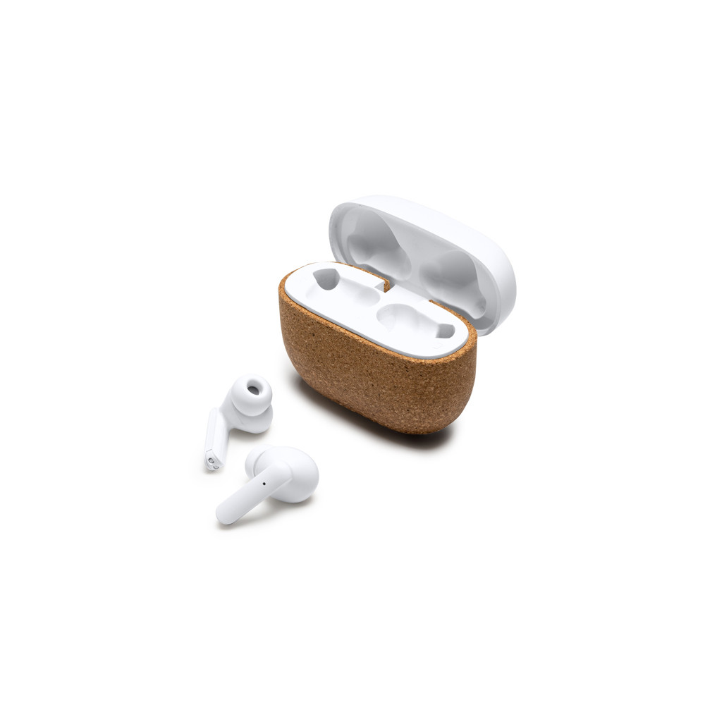 Écouteurs sans fil en ABS recyclé et liège naturel. Boîtier de chargement avec batterie rechargeable. Panneau de commande tactile intégré à l'écouteur. Fonction mains libres. Connexion de type C. Câble fourni. Présentation en boîte écodesign.Destinataire :