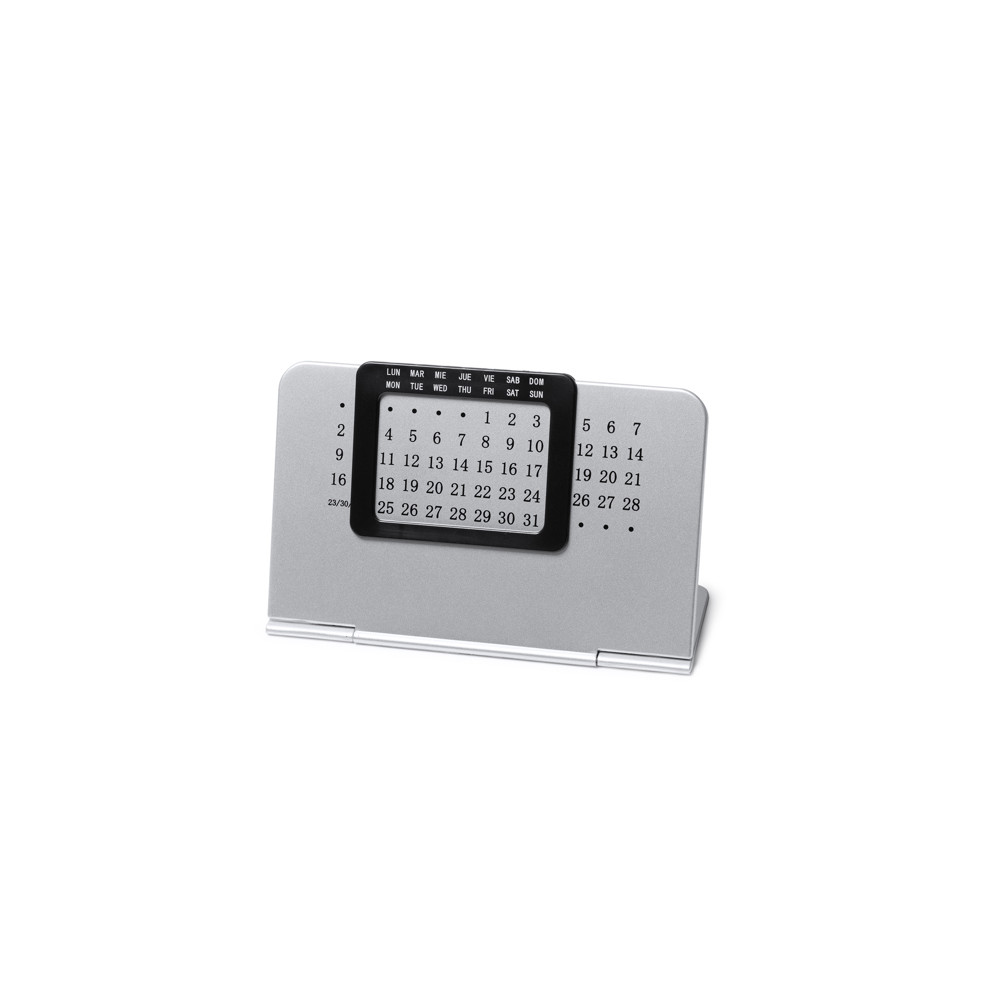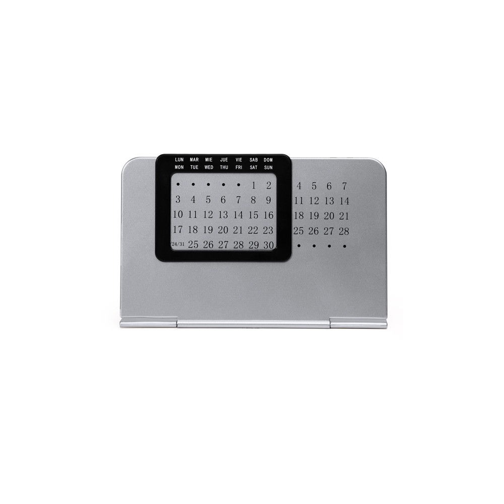 Calendrier de table. Compatible pour une utilisation dans n'importe quelle année. Composé de deux parties: support argenté avec panneau numéroté et cadre coulissant noir avec les jours de la semaine en espagnol et anglais.Destinataire :