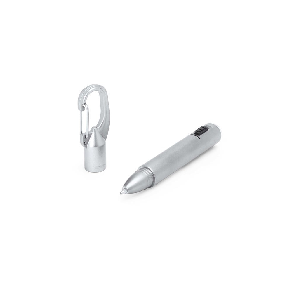 Stylo avec lampe de poche LED, disponible en différentes couleurs avec finition métallique et bouton noir. Mousqueton intégré dans le capuchon. Chargement de l'encre bleue.Destinataire :