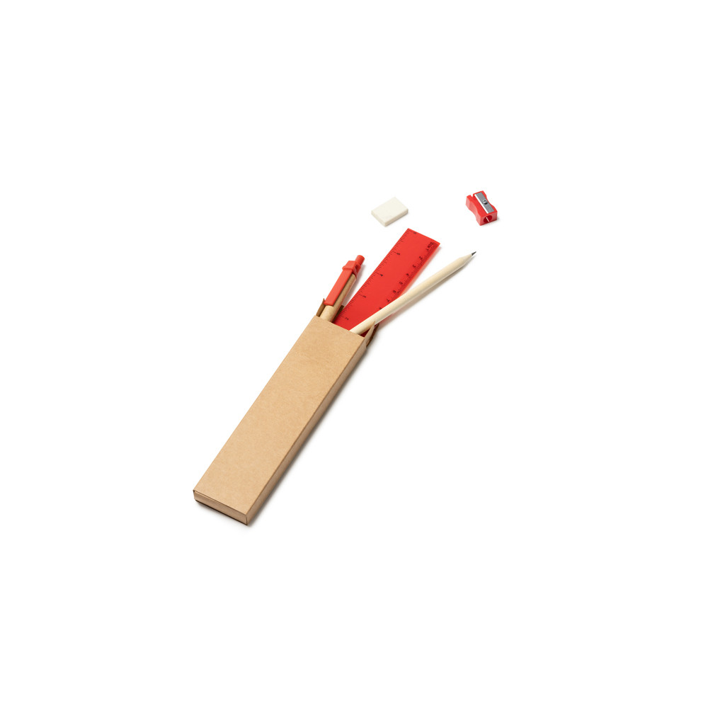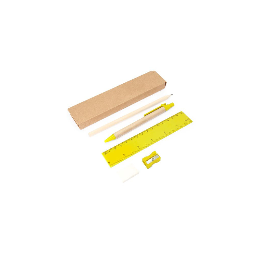 Ensemble de 5 pièces présenté dans une boîte en carton kraft. Comprend un stylo avec un corps en carton et une encre bleue, un crayon en bois, un taille-crayon, une gomme à effacer et une règle de 15 cm.Destinataire :