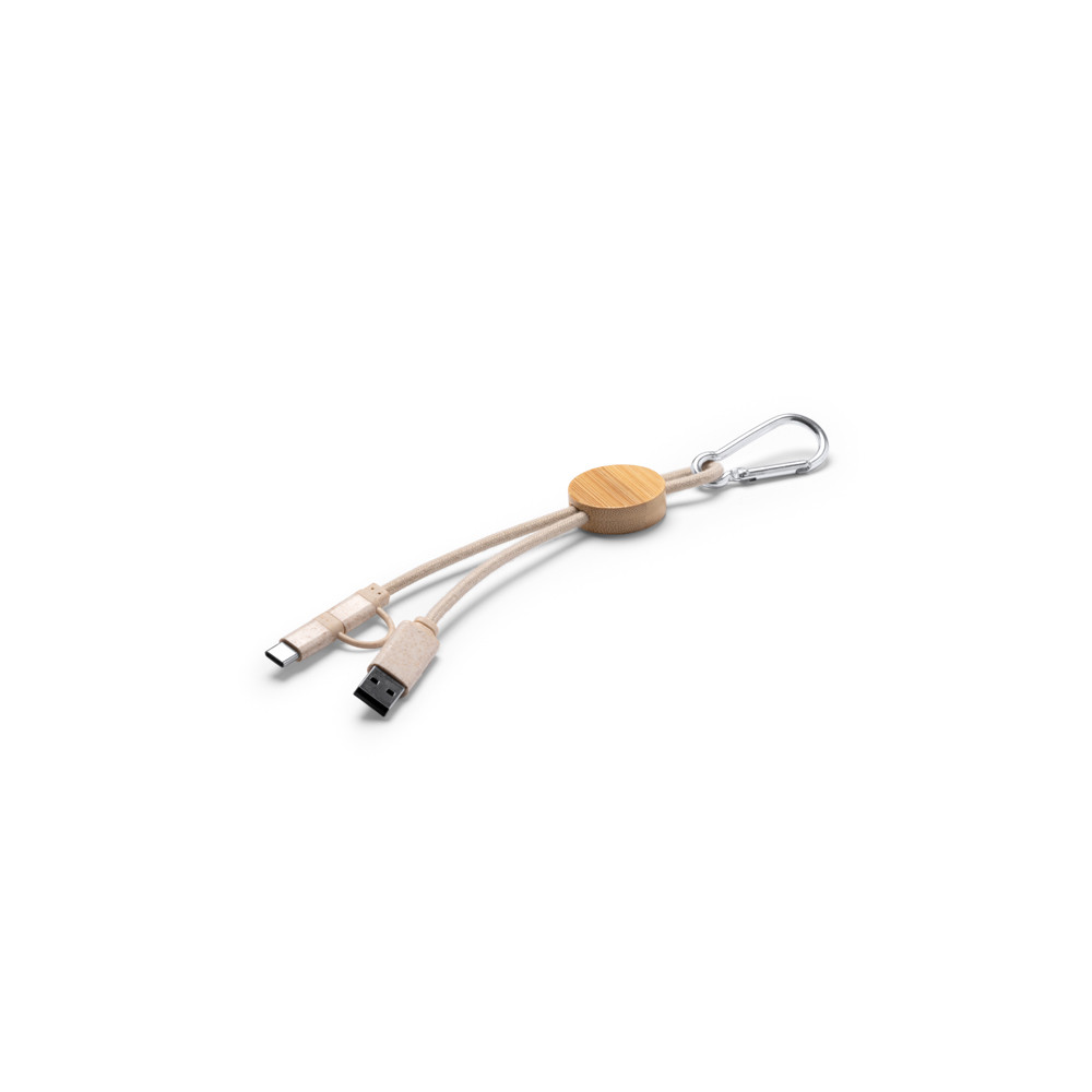 Câble 4-en-1. Structure principale en bambou, câble en coton et détails en fibre de blé. Entrées USB et Type C. Sorties USB, Type C et Lightning. Mousqueton inclus. Présentation en sachet individuel écodesign.Destinataire :