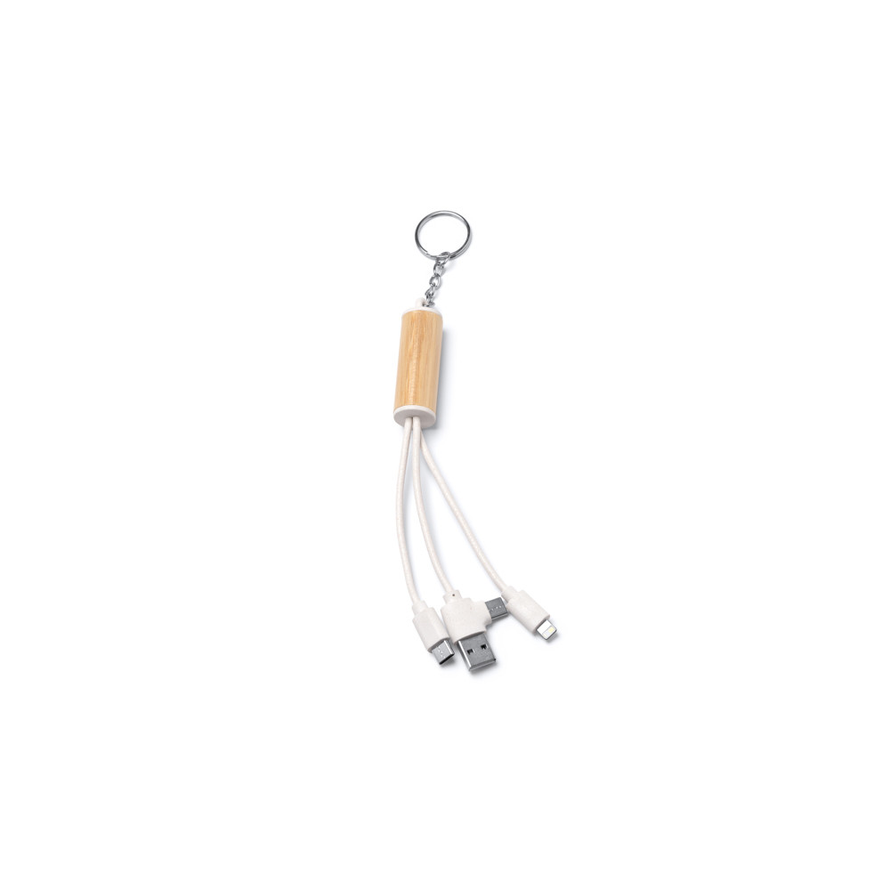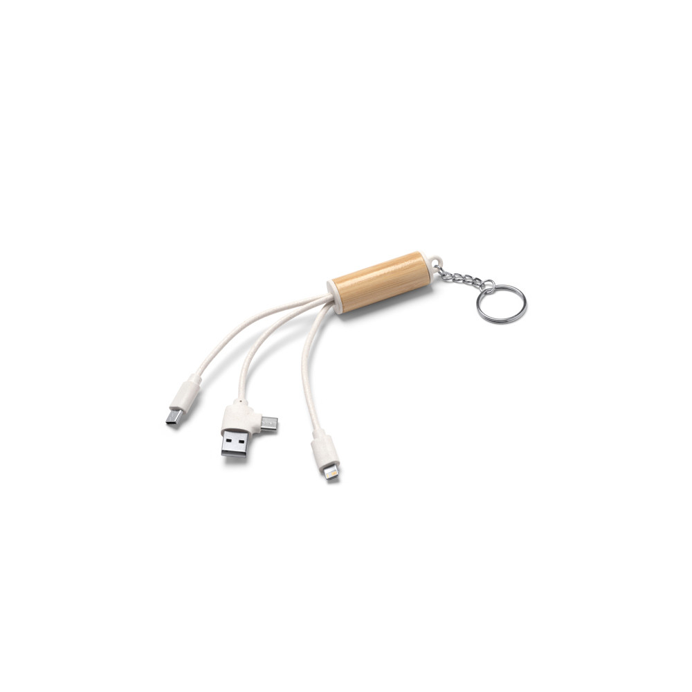 Câble de charge 5-en-1. Structure principale en bambou et fibre de blé. Entrée USB et type C. Sortie USB, Micro USB, type C et Lightning. Présentation en sachet individuel écodesign.Destinataire :