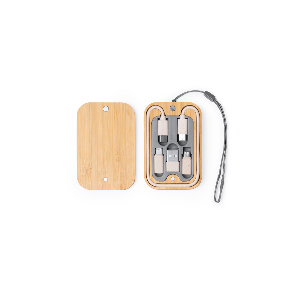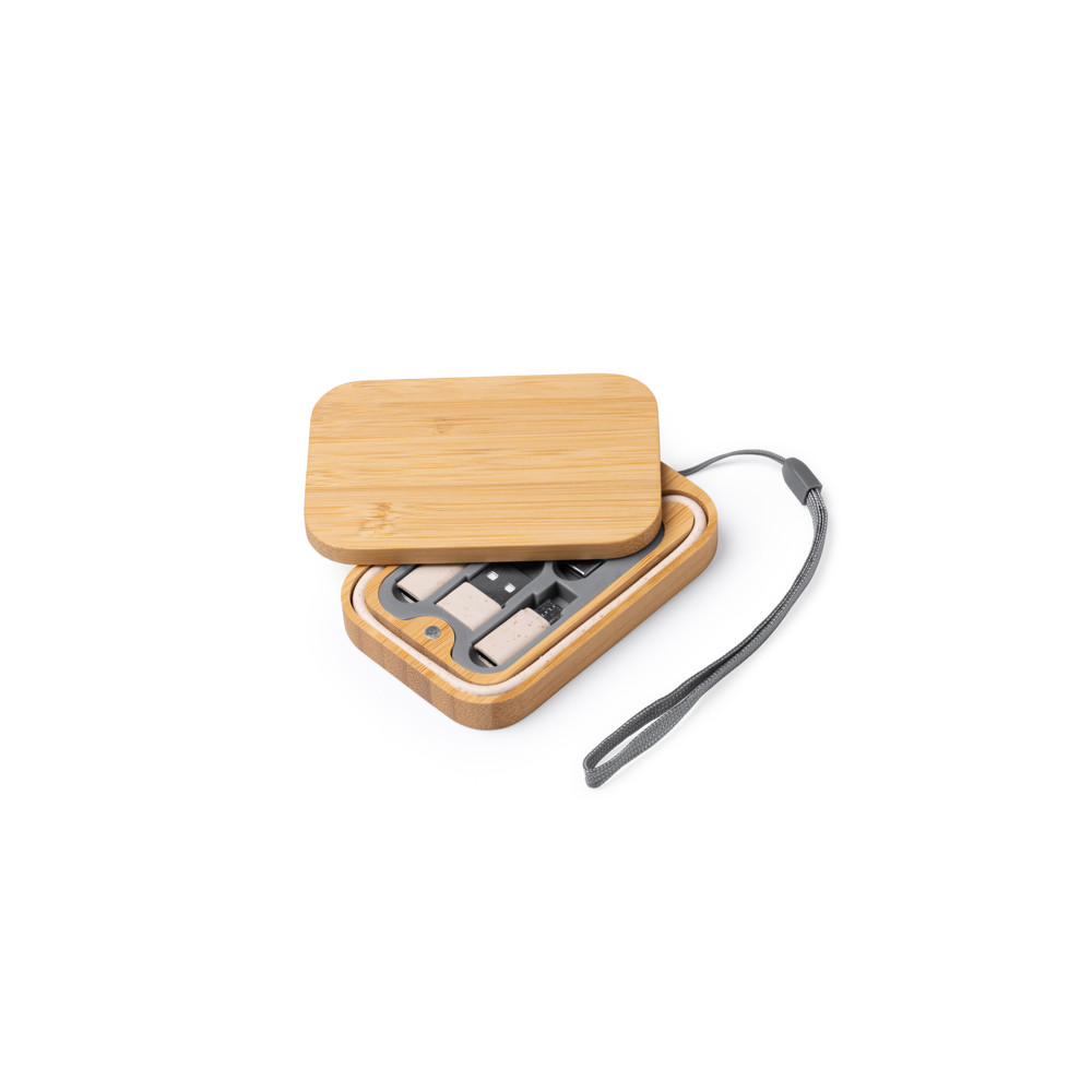 Ensemble de câbles de charge présenté dans un étui en bambou avec couvercle magnétisé. Micro USB, Type C et Lightning. Poignée de transport pratique fournie. Présentation en boîte écodesign.Destinataire :