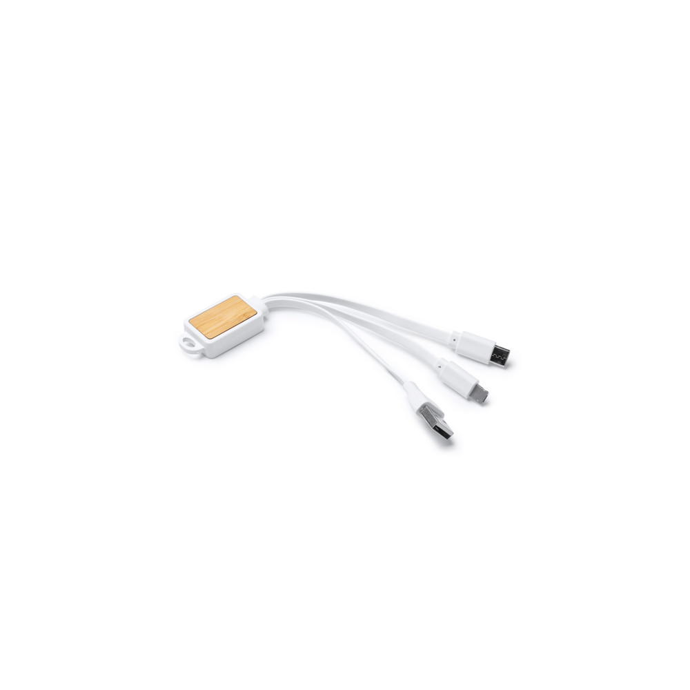 Câble chargeur 3 en 1, Eco. Corps en bambou rectangulaire (2,7 x 1,6 cm). Type C, USB et double connexion (Micro USB et iPhone). Présentation dans un sac en papier brun avec fenêtre.Destinataire :