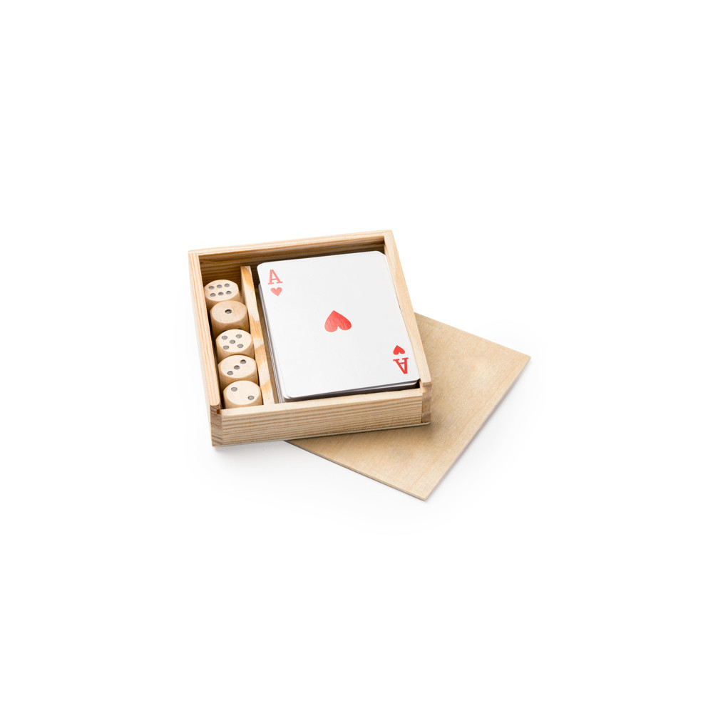 Ensemble de 2 jeux de société : jeu de dés et cartes françaises. Présenté dans une boîte en bois avec deux compartiments et un couvercle coulissant.Destinataire :