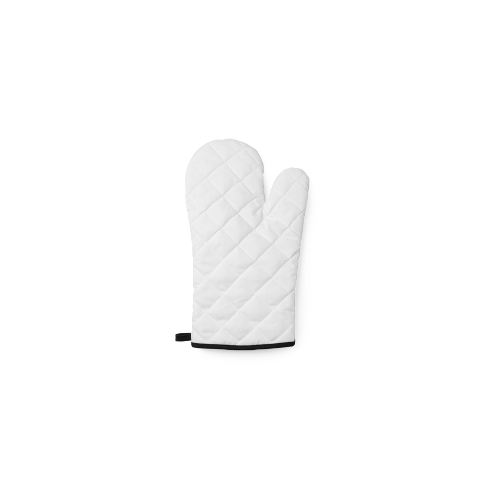 Gant de cuisine en polyester. Fini en blanc avec des bords colorés et du ruban de suspension. Visage lisse idéal pour la sublimation. Mitaine idéale pour un usage quotidien.Destinataire :