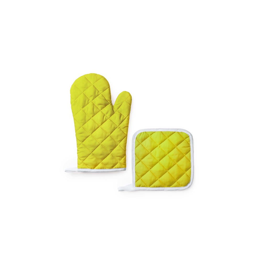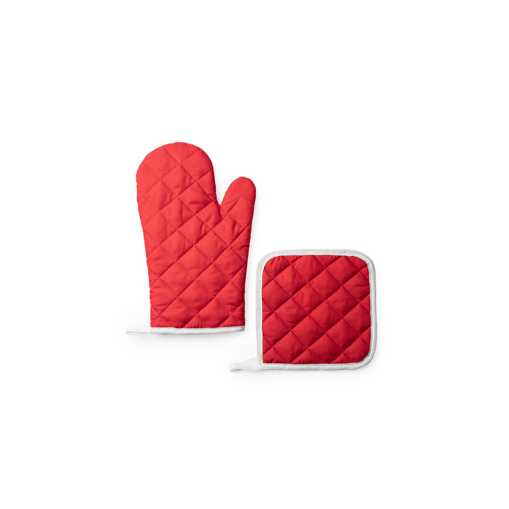 Kitchen set with pot holder and mitt in soft cotton/polyester. One flat side ideal for marking and hanging strap. Available in different colours.Destinataire :