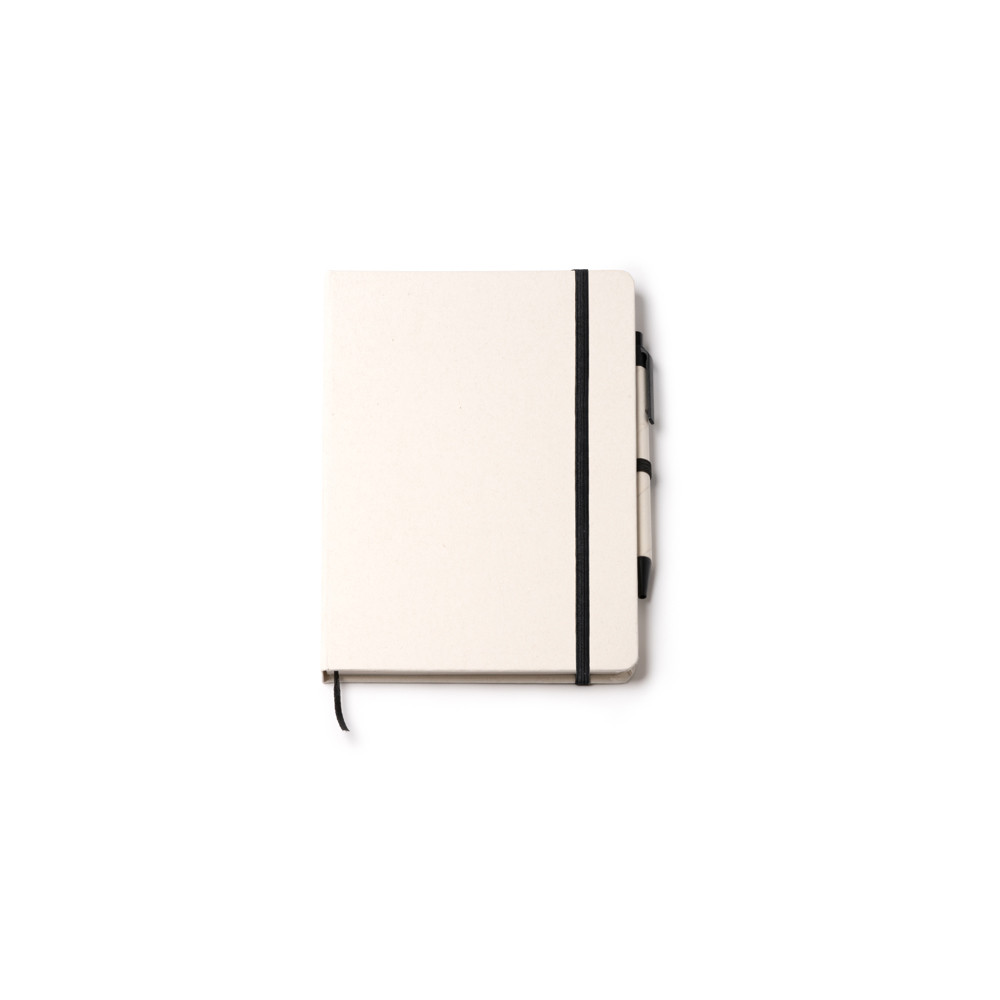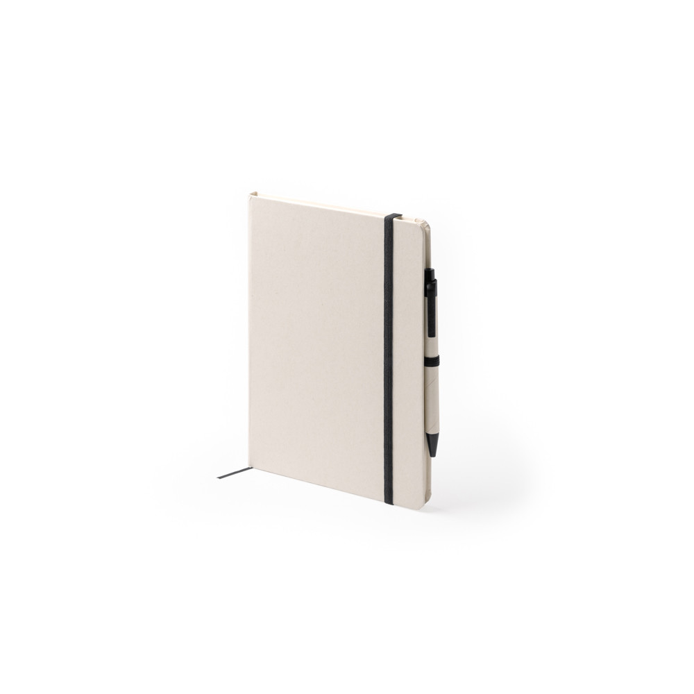 Bloc-notes A5 fabriqué à partir de cartons de lait recyclés. Couvertures rigides avec bande élastique et marque-page. Stylo à bille à encre bleue inclus. 100 feuilles unies.Destinataire :