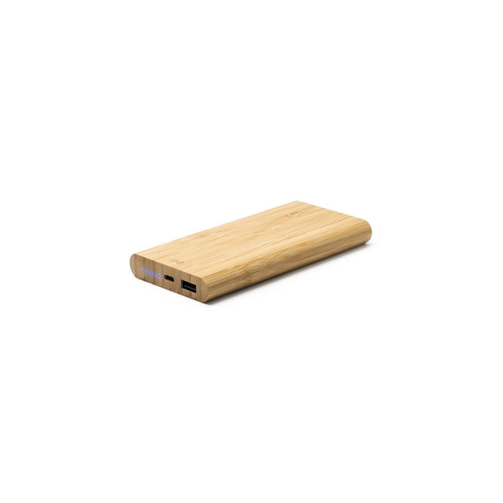 Batterie externe de 6000 mAh avec fonction de charge sans fil, fabriquée avec un boîtier en bambou. Sortie de courant DC 5 V/2.1 A, DC 5 V sans fil. Comprend un câble de type C.Destinataire :