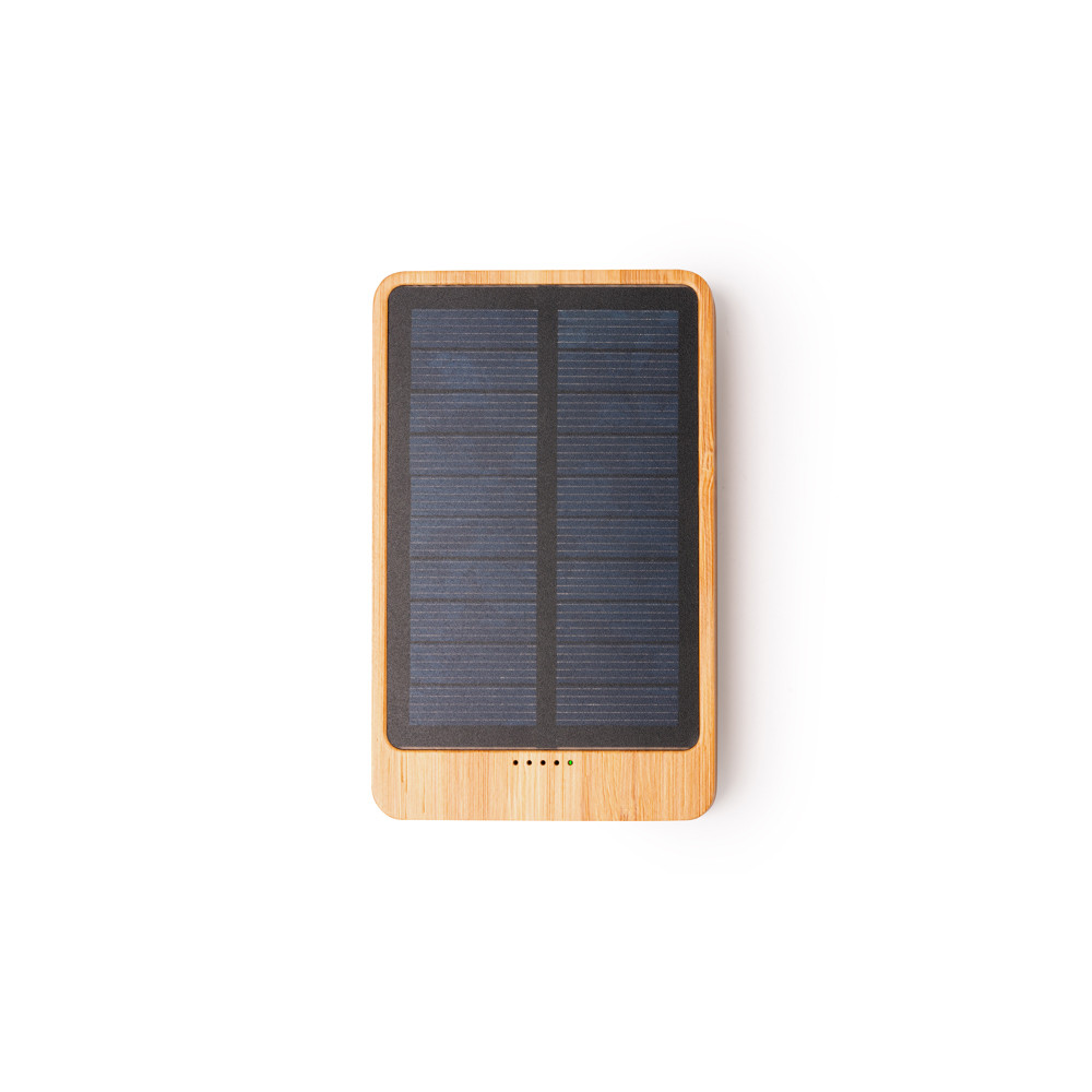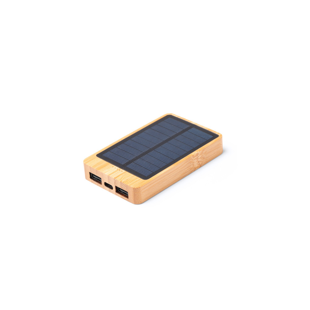 Power bank solaire en bambou de 5 000 mAh. Entrée de type C. Une sortie Type C et deux sorties USB. Présentation en boîte écodesign.Destinataire :