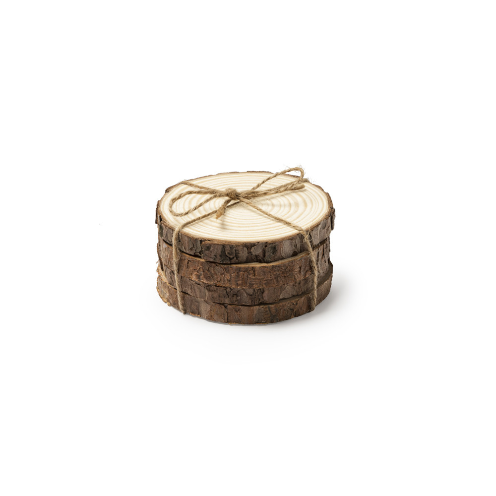 Service de 4 sous-verres en bois de pin naturel. Présentation nouée avec un cordon de jute naturel à l'intérieur d'une boîte éco conception.Destinataire :