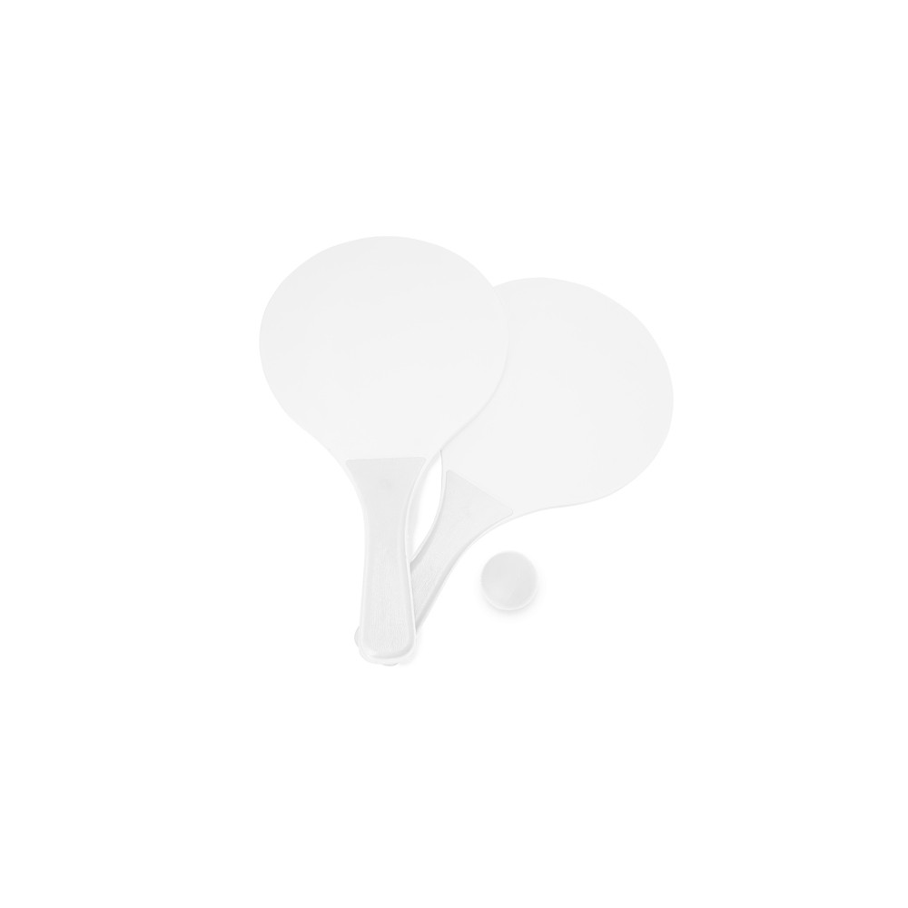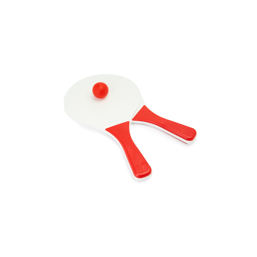 Un ensemble de deux raquettes de plage avec une balle. Manche en couleur, raquette en blanc et balle assortie au manche. Présentation dans un sac en filet.Destinataire :