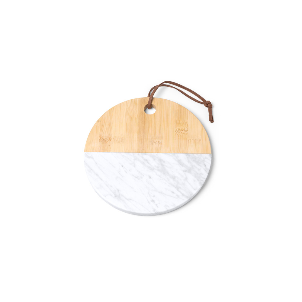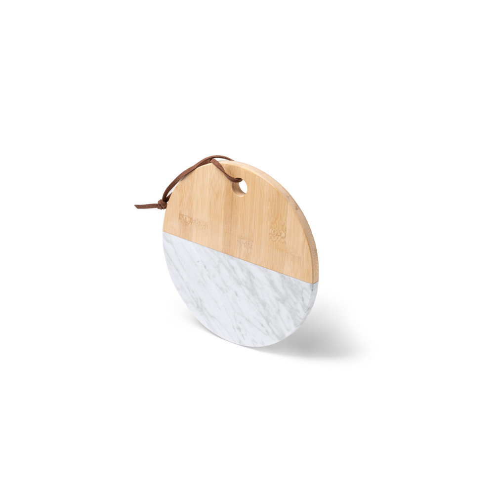 Planche à découper en bambou naturel et marbre. Sangle de transport en simili cuir incluse. Présentation en boîte écodesign.Destinataire :