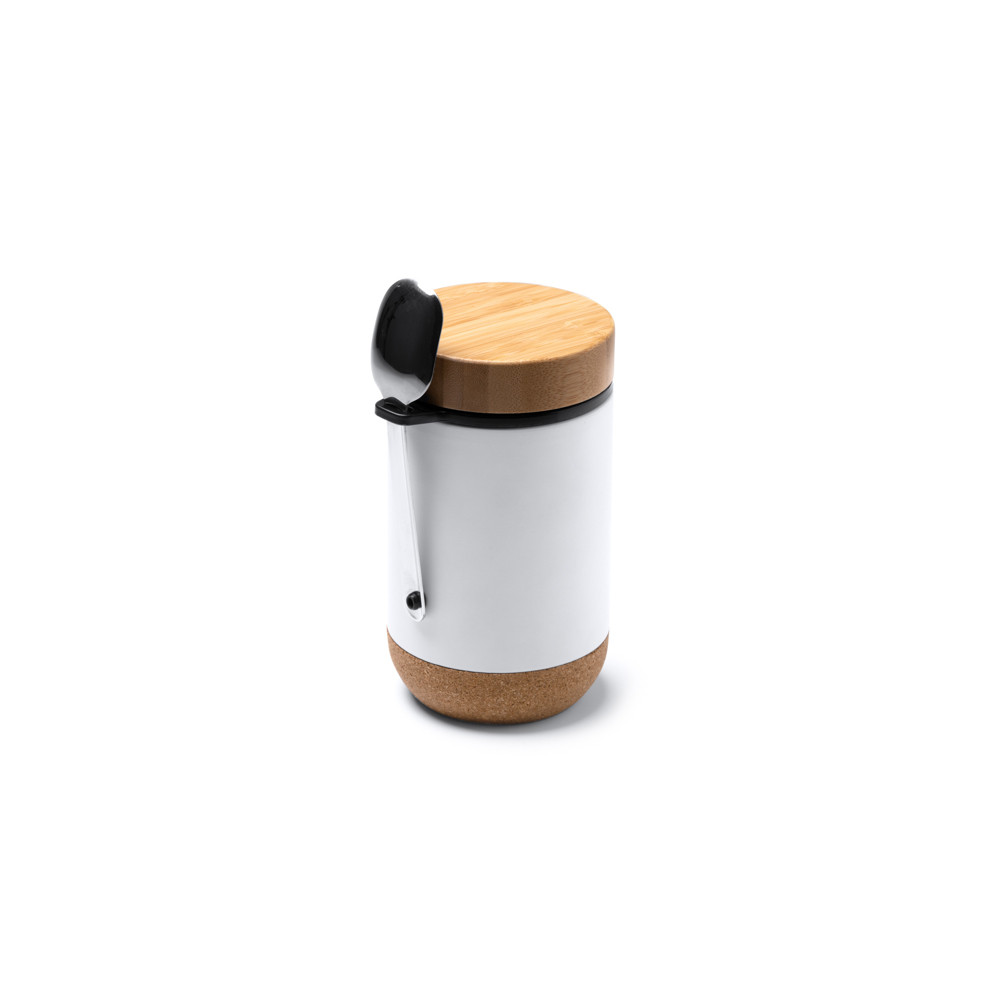 Thermos multifonctions en acier inoxydable 304, idéal pour l'alimentation. Couvercle en bambou et fond en liège. Cuillère incluse. Capacité de 400 ml. Présentation en boîte écodesign.Destinataire :