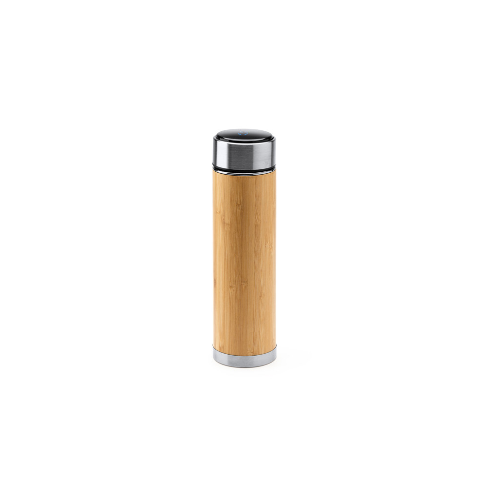 Thermos double paroi en acier inoxydable 304 et bambou avec filtre à thé. Thermomètre numérique tactile sur le couvercle. Capacité 480 ml. Pile bouton incluse Présentation en boîte écodesign.Destinataire :