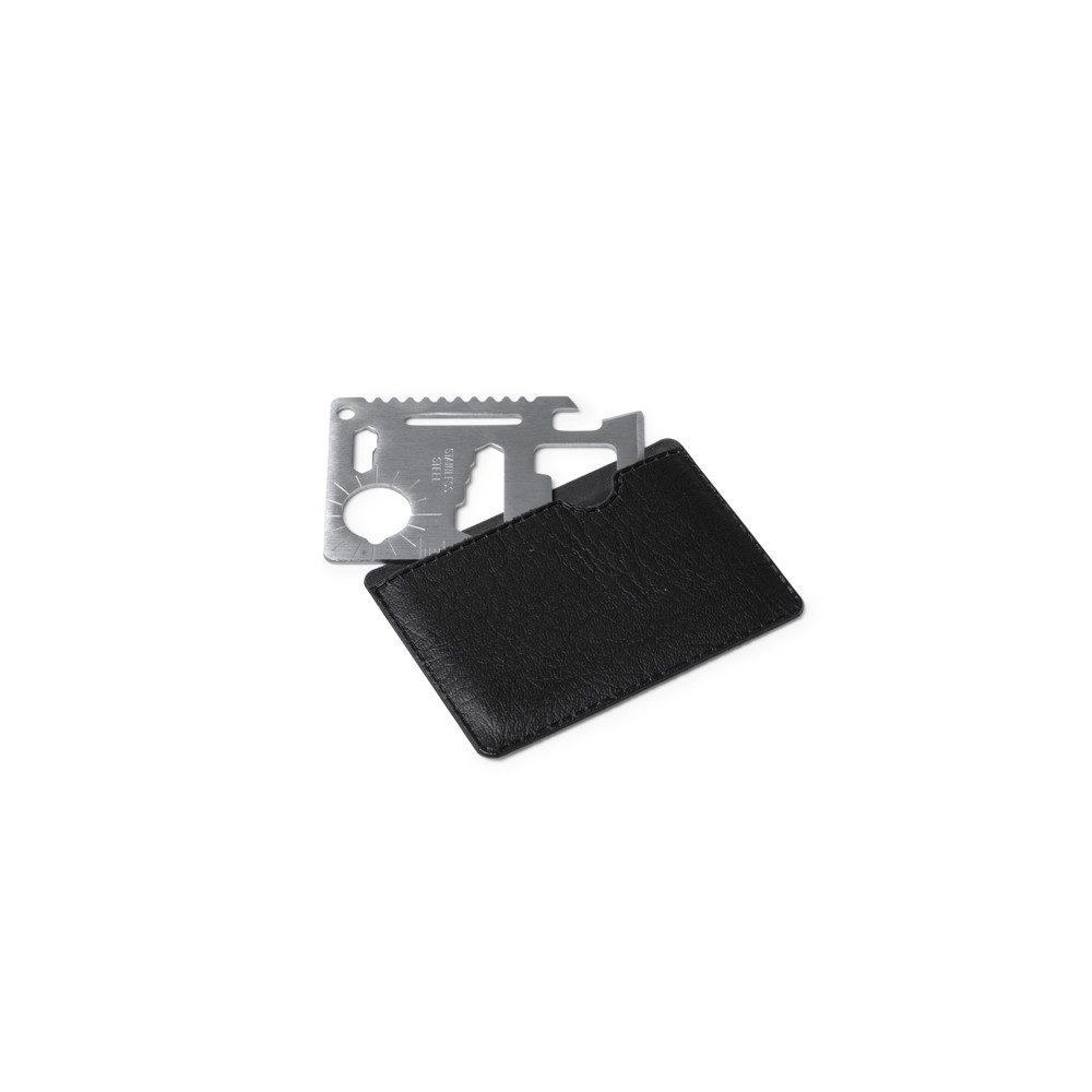 Outil multifonction en acier inoxydable avec 11 fonctions intégrées. Outil polyvalent qui comprend : un ouvre-boîte, un couteau tranchant, un tournevis, une règle, un ouvre-bouteille, une clé à molette, une clé papillon, une scie pour les petites tâches et un indicateur de direction. Présentation dans un boitier PU.Destinataire :