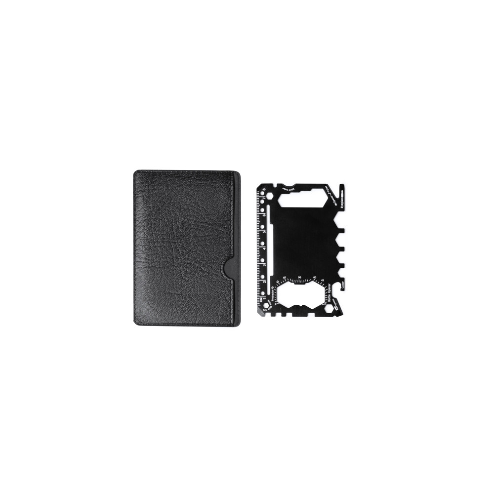 Outil multifonction en acier inoxydable avec 17 fonctions intégrées. Outil polyvalent qui comprend : un ouvre-boîte, un couteau tranchant, un tournevis, une règle, un ouvre-bouteille, une clé à molette, une clé papillon, une scie, un indicateur de direction et un transporteur d'angle. Présentation dans un boitier PU.Destinataire :