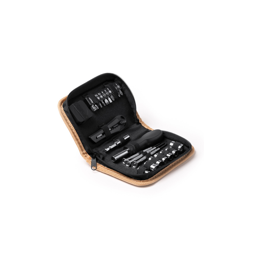 Ensemble d'outils de 25 accessoires. Outil de coupe, clé hexagonale, tournevis étoile et plat, outil de fixation et ruban à mesurer de 100 cm. Présentation dans un étui en liège et une boite écodesign.Destinataire :