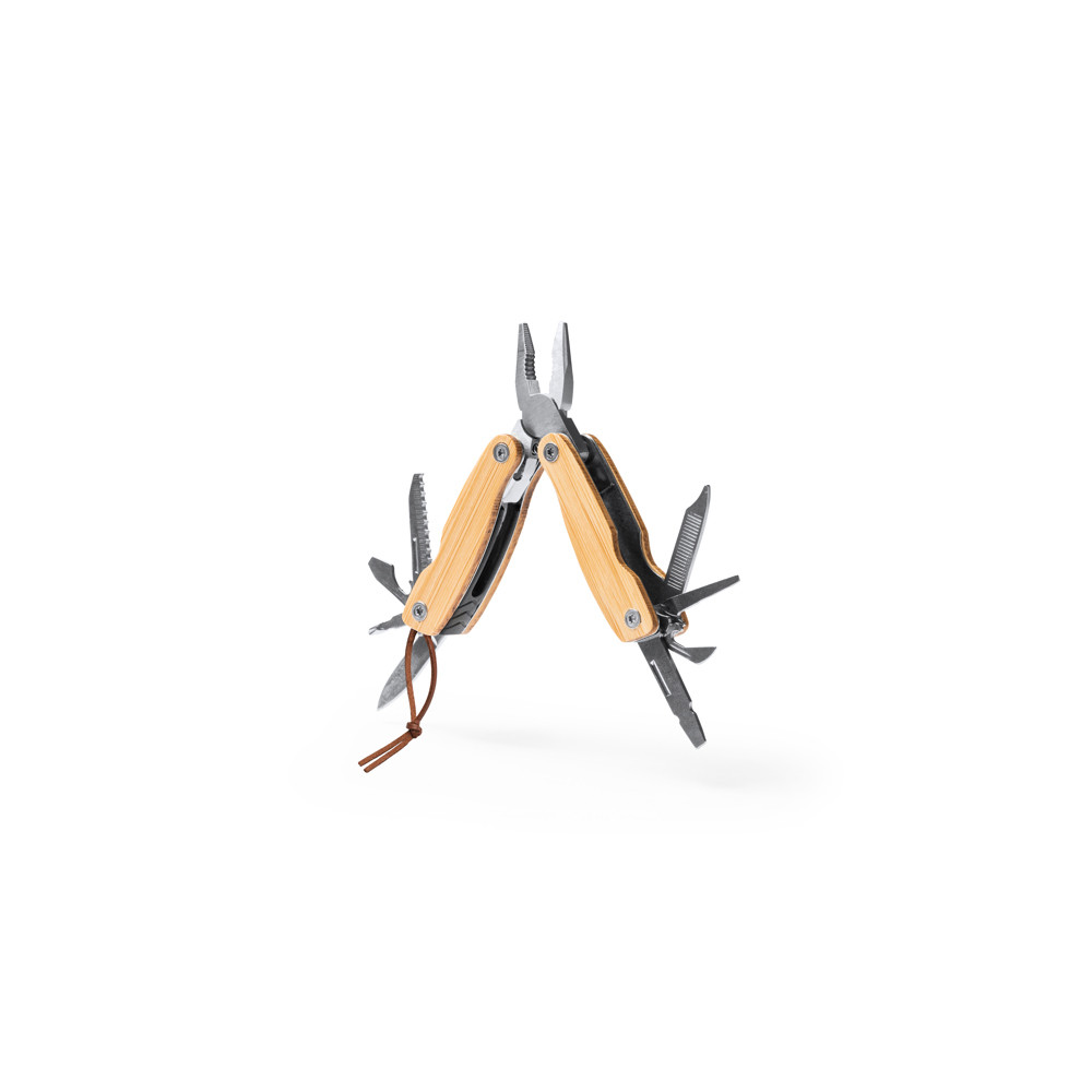 Multi-outil avec corps et accessoires en acier inoxydable et poignée en bambou. 12 fonctions : rasoir, scie, limes, ouvre-portes, tournevis et pinces. Comprend du ruban adhésif pour le transport.Destinataire :