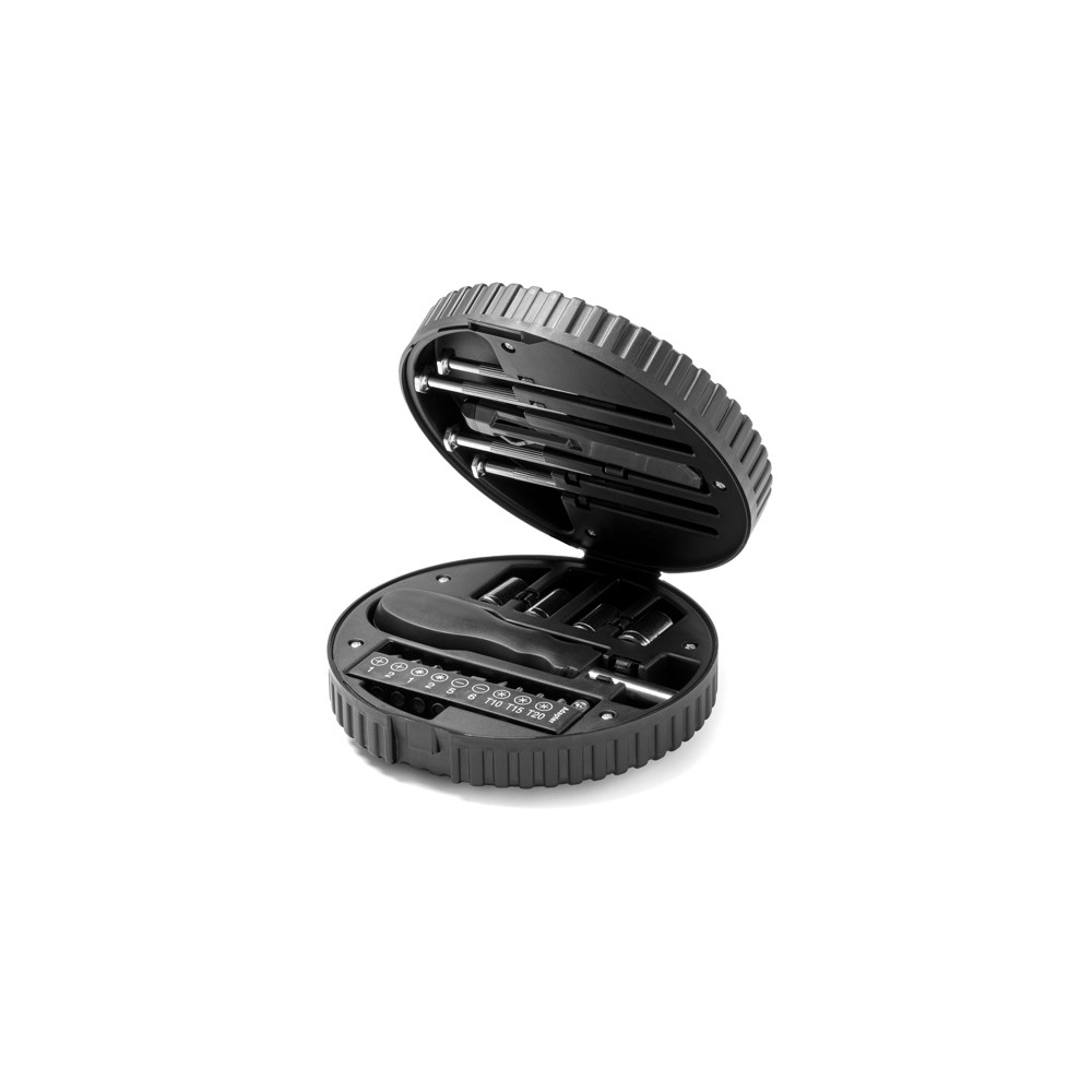 Ensemble d'outils avec 20 accessoires : cutter, clés hexagonales, tournevis cruciformes et plats et outil de fixation. L'ensemble d'outils est livré dans une pochette de conception de roue.Destinataire :