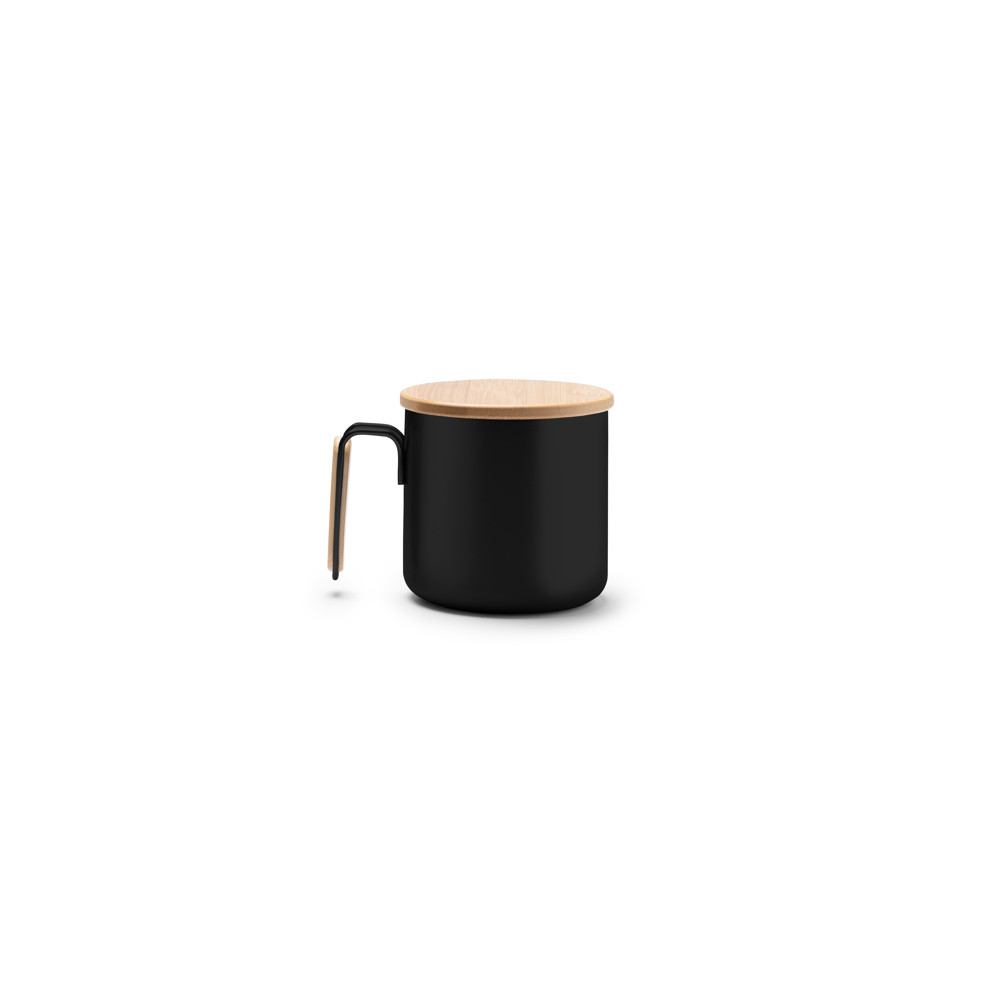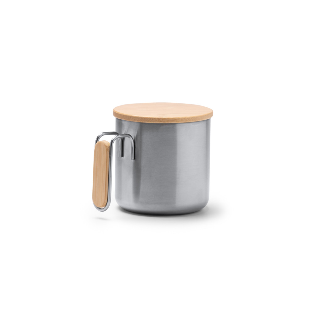 Tasse en acier inoxydable 304 recyclé avec des détails en bambou dans la poignée. Capacité de 350 ml. Présentation en boîte écodesign.Destinataire :